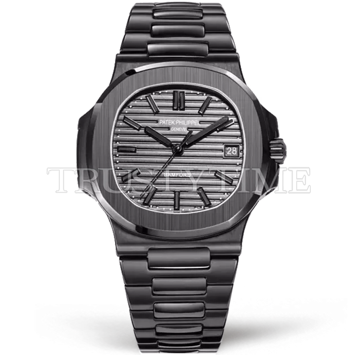Часы Patek Philippe из коллекции Nautilus. Классические мужские часы Patek Philippe Nautilus 40mm Bamford 5711 премиального качества (Артикул магазина: PP-0806) оснащены надежным автоматическим механизмом с автоподзаводом (работает от амплитуды движения руки) калибра PP324, в котором реализованы следующие функции: часовая, минутная и секундная стрелки, а так же дата. Восьмиугольный корпус часов черного цвета, имеющий размер 40 мм и высоту 8.3 мм превосходно дополнит образ и украсит запястье своего обладателя. Для изготовления часов Patek Philippe Nautilus 40mm Bamford 5711 предлагаемых в нашем интернет-магазине, применяются нержавеющая сталь 316F высокого качества (Швейцарский стандарт), а так же сапфировое стекло высокой прочности, благодаря чему обеспечивается максимальная защита от сколов и механических повреждений. Отличительной чертой данной модели является черный циферблат, часовые индексы которого обеспечивают часовые метки. Завершает образ браслет из нержавеющей стали черного цвета с фирменной раскладывающейся застежкой Patek Philippe. Водонепроницаемость данной модели составляет 30М (WR30) – допускается минимальное воздействие с водой.