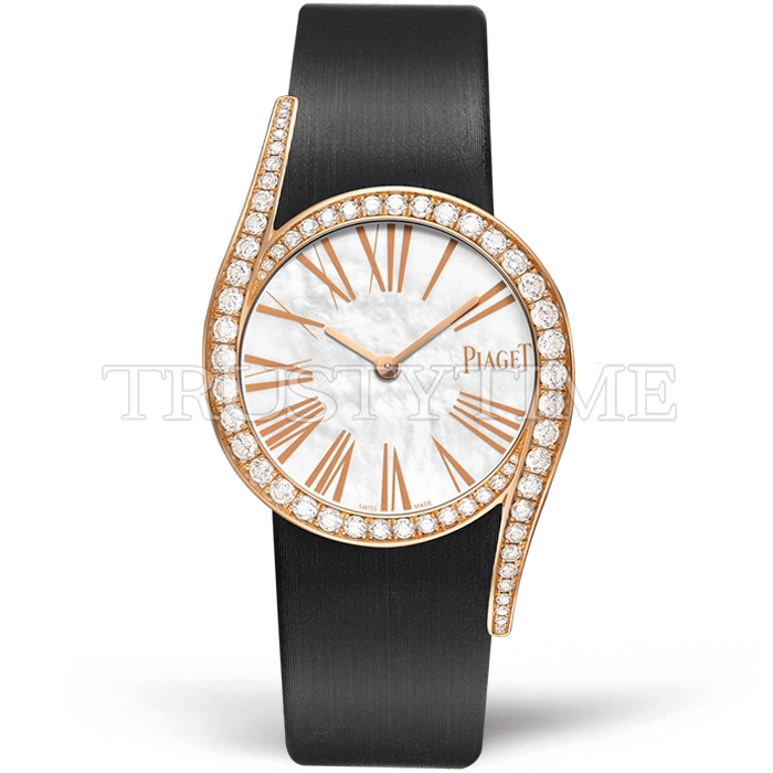 Часы Piaget из коллекции Limelight. Классические женские часы Piaget Limelight Gala 32mm G0A41291 премиального качества (Артикул магазина: PG-0166) оснащены надежным кварцевым механизмом (работает от батареи) калибра Swiss Quartz ETA, в котором реализованы следующие функции: часова и минутка стрелки, а так же максимально простой функционал без усложнений. Круглый корпус часов розового цвета, имеющий размер 32 мм и высоту 7.5 мм превосходно дополнит образ и украсит запястье своего обладателя. Для изготовления часов Piaget Limelight Gala 32mm G0A41291 предлагаемых в нашем интернет-магазине, применяются нержавеющая сталь 316F высокого качества (Швейцарский стандарт), а так же сапфировое стекло высокой прочности, благодаря чему обеспечивается максимальная защита от сколов и механических повреждений. Отличительной чертой данной модели является перламутровый циферблат, часовые индексы которого обеспечивают римские цифры. Завершает образ сатиновый ремешок черного цвета с фирменной классической застежкой Piaget. Водонепроницаемость данной модели составляет 30М (WR30) – допускается минимальное воздействие с водой.