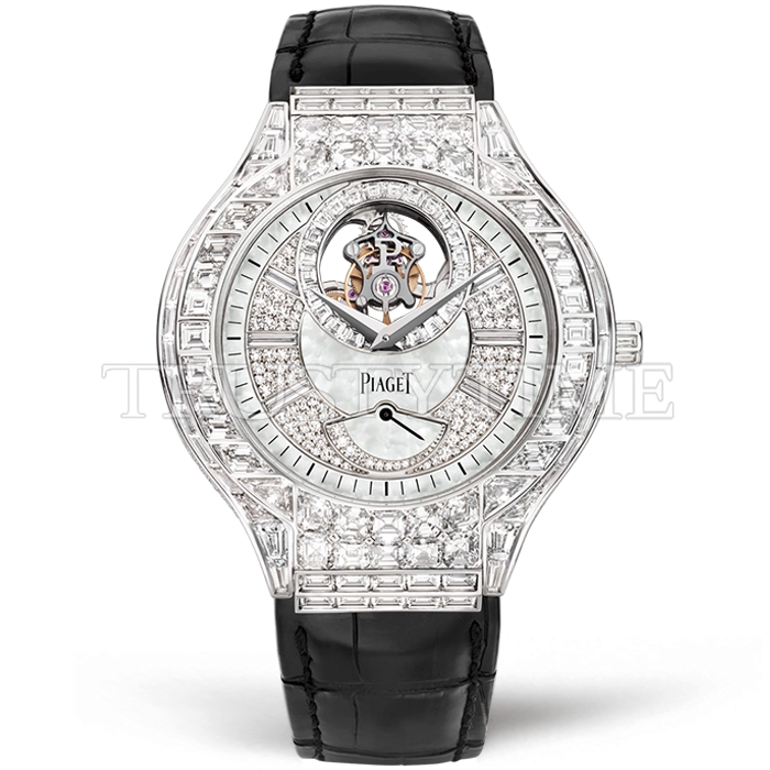 Часы Piaget из коллекции Polo. Классические мужские часы Piaget Polo Tourbillon 44mm G0A38148 премиального качества (Артикул магазина: PG-0158) оснащены надежным автоматическим механизмом с ручным заводом калибра Seagull Handwind Tourbillon, в котором реализованы следующие функции: часова и минутка стрелки, а так же турбийон, резерв хода. Круглый корпус часов стального цвета, имеющий размер 46 мм X 57.5 мм и высоту 12 мм превосходно дополнит образ и украсит запястье своего обладателя. Для изготовления часов Piaget Polo Tourbillon 44mm G0A38148 предлагаемых в нашем интернет-магазине, применяются нержавеющая сталь 316L высокого качества (Швейцарский стандарт), а так же сапфировое стекло высокой прочности, благодаря чему обеспечивается максимальная защита от сколов и механических повреждений. Отличительной чертой данной модели является перламутровый циферблат, часовые индексы которого обеспечивают часовые метки. Завершает образ кожаный ремешок черного цвета с фирменной раскладывающейся застежкой Piaget. Водонепроницаемость данной модели составляет 30М (WR30) – допускается минимальное воздействие с водой.