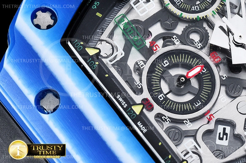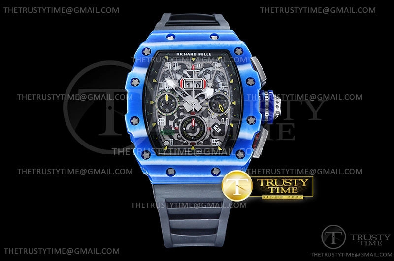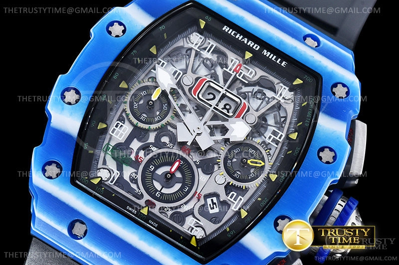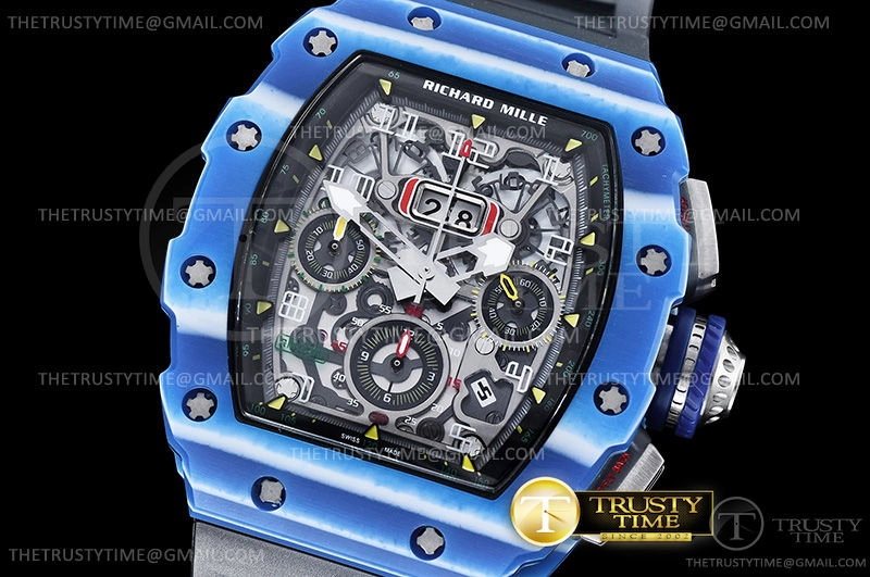 Часы Richard Mille из коллекции RM011. Спортивные мужские часы Richard Mille RM011-03 Auto Flyback Chronograph премиального качества (Артикул магазина: RM-0260) оснащены надежным автоматическим механизмом с автоподзаводом (работает от амплитуды движения руки) калибра Valjoux-7750, в котором реализованы следующие функции: часовая, минутная и секундная стрелки, а так же хронограф, дата. Бочкообразный корпус часов синего цвета, имеющий размер 41 мм и высоту 17.5 мм превосходно дополнит образ и украсит запястье своего обладателя. Для изготовления часов Richard Mille RM011-03 Auto Flyback Chronograph предлагаемых в нашем интернет-магазине, применяются кованый карбон высокого качества (Швейцарский стандарт), а так же сапфировое стекло высокой прочности, благодаря чему обеспечивается максимальная защита от сколов и механических повреждений. Отличительной чертой данной модели является скелетонизированный циферблат, часовые индексы которого обеспечивают арабские цифры. Завершает образ каучуковый ремешок черного цвета с фирменной раскладывающейся застежкой Richard Mille. Водонепроницаемость данной модели составляет 30М (WR30) – допускается минимальное воздействие с водой.