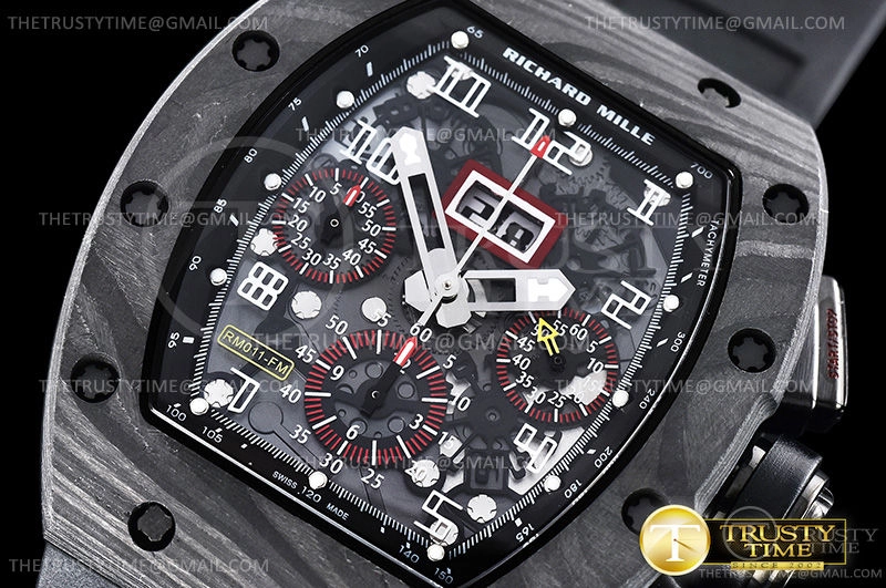 Часы Richard Mille из коллекции RM011. Спортивные мужские часы Richard Mille RM011 Felipe Massa премиального качества (Артикул магазина: RM-0249) оснащены надежным автоматическим механизмом с автоподзаводом (работает от амплитуды движения руки) калибра Valjoux-7750, в котором реализованы следующие функции: часовая, минутная и секундная стрелки, а так же хронограф, дата. Бочкообразный корпус часов черного цвета, имеющий размер 42 мм и высоту 18 мм превосходно дополнит образ и украсит запястье своего обладателя. Для изготовления часов Richard Mille RM011 Felipe Massa предлагаемых в нашем интернет-магазине, применяются кованый карбон высокого качества (Швейцарский стандарт), а так же сапфировое стекло высокой прочности, благодаря чему обеспечивается максимальная защита от сколов и механических повреждений. Отличительной чертой данной модели является скелетонизированный циферблат, часовые индексы которого обеспечивают арабские цифры. Завершает образ каучуковый ремешок черного цвета с фирменной раскладывающейся застежкой Richard Mille. Водонепроницаемость данной модели составляет 30М (WR30) – допускается минимальное воздействие с водой.
