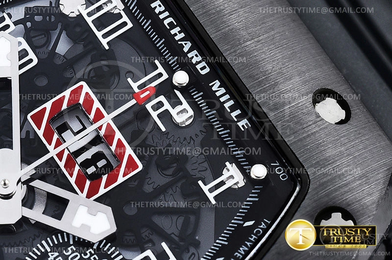Часы Richard Mille из коллекции RM011. Спортивные мужские часы Richard Mille RM011 Felipe Massa премиального качества (Артикул магазина: RM-0253) оснащены надежным автоматическим механизмом с автоподзаводом (работает от амплитуды движения руки) калибра Valjoux-7750, в котором реализованы следующие функции: часовая, минутная и секундная стрелки, а так же хронограф, дата. Бочкообразный корпус часов черного цвета, имеющий размер 42 мм и высоту 18 мм превосходно дополнит образ и украсит запястье своего обладателя. Для изготовления часов Richard Mille RM011 Felipe Massa предлагаемых в нашем интернет-магазине, применяются нержавеющая сталь 316L высокого качества (Швейцарский стандарт), а так же сапфировое стекло высокой прочности, благодаря чему обеспечивается максимальная защита от сколов и механических повреждений. Отличительной чертой данной модели является скелетонизированный циферблат, часовые индексы которого обеспечивают арабские цифры. Завершает образ каучуковый ремешок черного цвета с фирменной раскладывающейся застежкой Richard Mille. Водонепроницаемость данной модели составляет 30М (WR30) – допускается минимальное воздействие с водой.