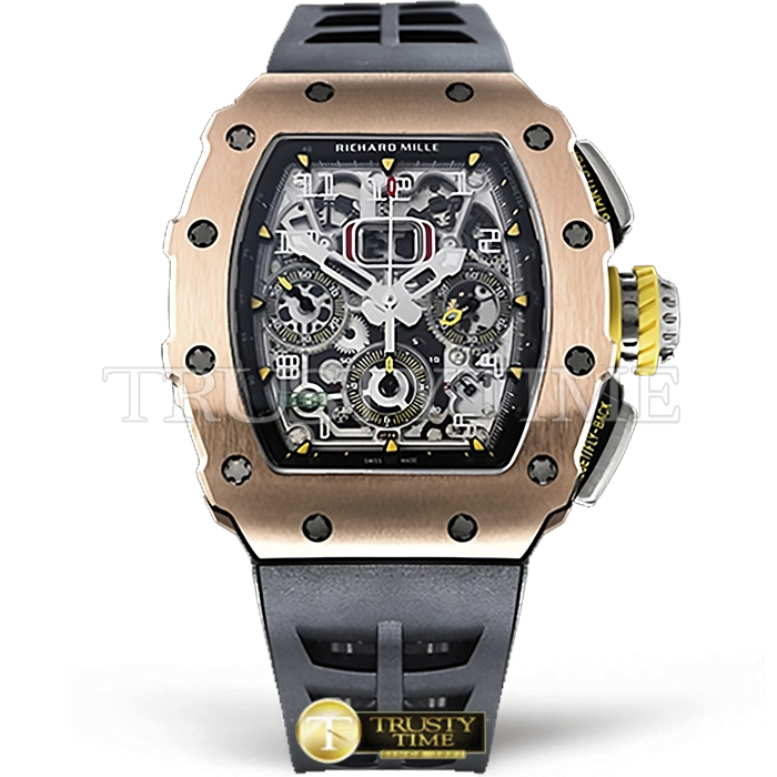 Часы Richard Mille из коллекции RM011. Спортивные мужские часы Richard Mille RM011-03 Felipe Massa премиального качества (Артикул магазина: RM-0231) оснащены надежным автоматическим механизмом с автоподзаводом (работает от амплитуды движения руки) калибра Valjoux-7750, в котором реализованы следующие функции: часовая, минутная и секундная стрелки, а так же хронограф, дата. Бочкообразный корпус часов розового цвета, имеющий размер 42 мм и высоту 18 мм превосходно дополнит образ и украсит запястье своего обладателя. Для изготовления часов Richard Mille RM011-03 Felipe Massa предлагаемых в нашем интернет-магазине, применяются нержавеющая сталь 316L высокого качества (Швейцарский стандарт), а так же сапфировое стекло высокой прочности, благодаря чему обеспечивается максимальная защита от сколов и механических повреждений. Отличительной чертой данной модели является скелетонизированный циферблат, часовые индексы которого обеспечивают арабские цифры. Завершает образ каучуковый ремешок черного цвета с фирменной раскладывающейся застежкой Richard Mille. Водонепроницаемость данной модели составляет 30М (WR30) – допускается минимальное воздействие с водой.