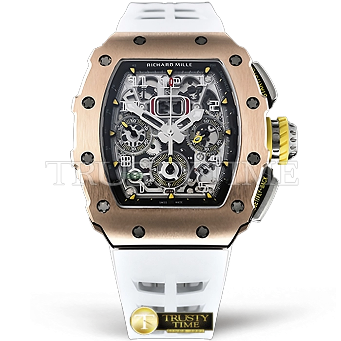 Часы Richard Mille из коллекции RM011. Спортивные мужские часы Richard Mille RM011-03 Felipe Massa премиального качества (Артикул магазина: RM-0233) оснащены надежным автоматическим механизмом с автоподзаводом (работает от амплитуды движения руки) калибра Valjoux-7750, в котором реализованы следующие функции: часовая, минутная и секундная стрелки, а так же хронограф, дата. Бочкообразный корпус часов розового цвета, имеющий размер 42 мм и высоту 18 мм превосходно дополнит образ и украсит запястье своего обладателя. Для изготовления часов Richard Mille RM011-03 Felipe Massa предлагаемых в нашем интернет-магазине, применяются нержавеющая сталь 316L высокого качества (Швейцарский стандарт), а так же сапфировое стекло высокой прочности, благодаря чему обеспечивается максимальная защита от сколов и механических повреждений. Отличительной чертой данной модели является скелетонизированный циферблат, часовые индексы которого обеспечивают арабские цифры. Завершает образ каучуковый ремешок белого цвета с фирменной раскладывающейся застежкой Richard Mille. Водонепроницаемость данной модели составляет 30М (WR30) – допускается минимальное воздействие с водой.
