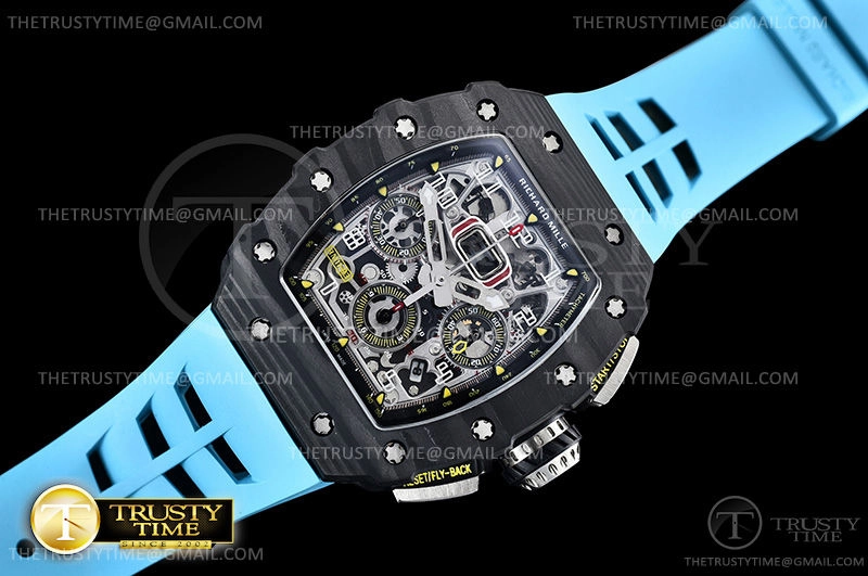 Часы Richard Mille из коллекции RM011. Спортивные мужские часы Richard Mille RM011-03 Flyback Chronograph премиального качества (Артикул магазина: RM-0202) оснащены надежным автоматическим механизмом с автоподзаводом (работает от амплитуды движения руки) калибра Valjoux-7750, в котором реализованы следующие функции: часовая, минутная и секундная стрелки, а так же хронограф, дата. Бочкообразный корпус часов черного цвета, имеющий размер 43 мм и высоту 19 мм превосходно дополнит образ и украсит запястье своего обладателя. Для изготовления часов Richard Mille RM011-03 Flyback Chronograph предлагаемых в нашем интернет-магазине, применяются кованый карбон высокого качества (Швейцарский стандарт), а так же сапфировое стекло высокой прочности, благодаря чему обеспечивается максимальная защита от сколов и механических повреждений. Отличительной чертой данной модели является скелетонизированный циферблат, часовые индексы которого обеспечивают арабские цифры. Завершает образ каучуковый ремешок голубого цвета с фирменной раскладывающейся застежкой Richard Mille. Водонепроницаемость данной модели составляет 30М (WR30) – допускается минимальное воздействие с водой.