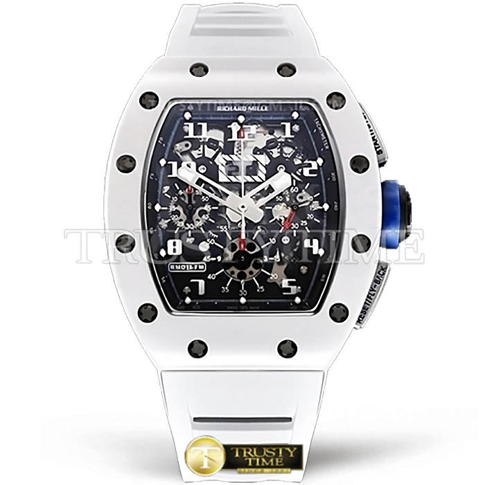 Часы Richard Mille из коллекции RM011. Спортивные мужские часы Richard Mille RM011-03 Flyback Chronograph Polo Edition премиального качества (Артикул магазина: RM-0200) оснащены надежным автоматическим механизмом с автоподзаводом (работает от амплитуды движения руки) калибра Valjoux-7750, в котором реализованы следующие функции: часовая, минутная и секундная стрелки, а так же хронограф, дата. Бочкообразный корпус часов белого цвета, имеющий размер 43 мм и высоту 19 мм превосходно дополнит образ и украсит запястье своего обладателя. Для изготовления часов Richard Mille RM011-03 Flyback Chronograph Polo Edition предлагаемых в нашем интернет-магазине, применяются керамика высокого качества (Швейцарский стандарт), а так же сапфировое стекло высокой прочности, благодаря чему обеспечивается максимальная защита от сколов и механических повреждений. Отличительной чертой данной модели является скелетонизированный циферблат, часовые индексы которого обеспечивают часовые метки. Завершает образ каучуковый ремешок белого цвета с фирменной раскладывающейся застежкой Richard Mille. Водонепроницаемость данной модели составляет 30М (WR30) – допускается минимальное воздействие с водой.