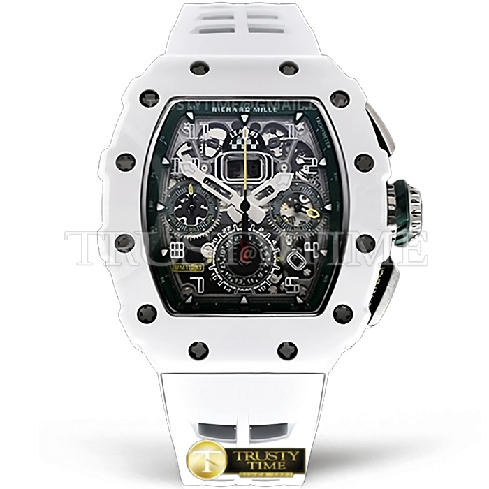 Часы Richard Mille из коллекции RM011. Спортивные мужские часы Richard Mille RM011-03 Flyback Chronograph Le Mans премиального качества (Артикул магазина: RM-0198) оснащены надежным автоматическим механизмом с автоподзаводом (работает от амплитуды движения руки) калибра Valjoux-7750, в котором реализованы следующие функции: часовая, минутная и секундная стрелки, а так же хронограф, дата. Бочкообразный корпус часов белого цвета, имеющий размер 43 мм и высоту 19 мм превосходно дополнит образ и украсит запястье своего обладателя. Для изготовления часов Richard Mille RM011-03 Flyback Chronograph Le Mans предлагаемых в нашем интернет-магазине, применяются керамика высокого качества (Швейцарский стандарт), а так же сапфировое стекло высокой прочности, благодаря чему обеспечивается максимальная защита от сколов и механических повреждений. Отличительной чертой данной модели является скелетонизированный циферблат, часовые индексы которого обеспечивают часовые метки. Завершает образ каучуковый ремешок белого цвета с фирменной раскладывающейся застежкой Richard Mille. Водонепроницаемость данной модели составляет 30М (WR30) – допускается минимальное воздействие с водой.