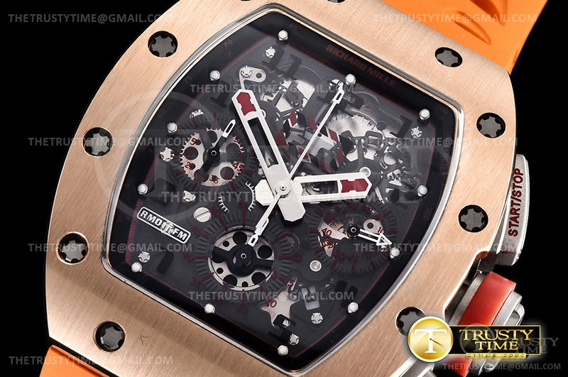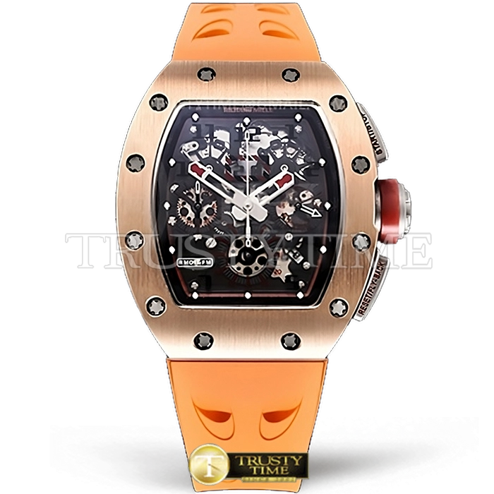 Часы Richard Mille из коллекции RM011. Спортивные мужские часы Richard Mille RM011-03 Flyback Chronograph Felipe M премиального качества (Артикул магазина: RM-0197) оснащены надежным автоматическим механизмом с автоподзаводом (работает от амплитуды движения руки) калибра Valjoux-7750, в котором реализованы следующие функции: часовая, минутная и секундная стрелки, а так же хронограф, дата. Бочкообразный корпус часов розового цвета, имеющий размер 43 мм и высоту 19 мм превосходно дополнит образ и украсит запястье своего обладателя. Для изготовления часов Richard Mille RM011-03 Flyback Chronograph Felipe M предлагаемых в нашем интернет-магазине, применяются нержавеющая сталь 316F высокого качества (Швейцарский стандарт), а так же сапфировое стекло высокой прочности, благодаря чему обеспечивается максимальная защита от сколов и механических повреждений. Отличительной чертой данной модели является скелетонизированный циферблат, часовые индексы которого обеспечивают часовые метки. Завершает образ каучуковый ремешок оранжевого цвета с фирменной раскладывающейся застежкой Richard Mille. Водонепроницаемость данной модели составляет 30М (WR30) – допускается минимальное воздействие с водой.