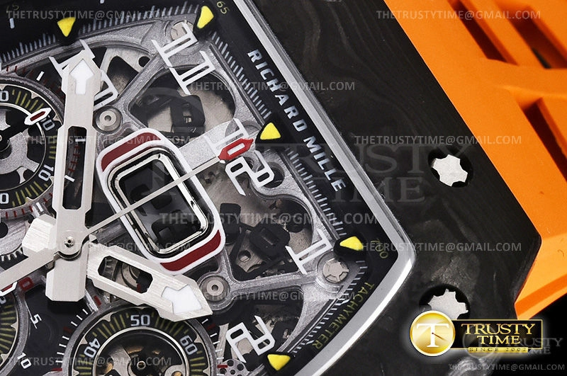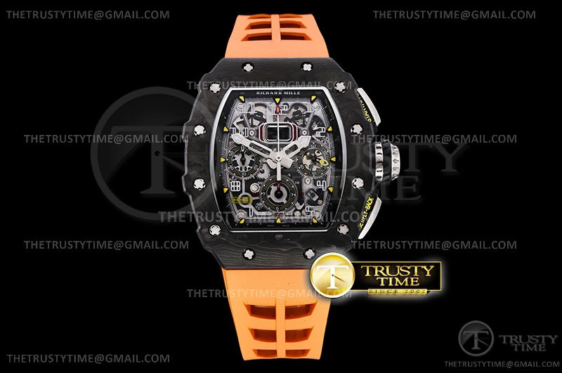 Часы Richard Mille из коллекции RM011. Спортивные мужские часы Richard Mille RM011-03 Auto Flyback Chronograph премиального качества (Артикул магазина: RM-0191) оснащены надежным автоматическим механизмом с автоподзаводом (работает от амплитуды движения руки) калибра Valjoux-7750, в котором реализованы следующие функции: часовая, минутная и секундная стрелки, а так же хронограф, дата. Бочкообразный корпус часов черного цвета, имеющий размер 43 мм и высоту 19 мм превосходно дополнит образ и украсит запястье своего обладателя. Для изготовления часов Richard Mille RM011-03 Auto Flyback Chronograph предлагаемых в нашем интернет-магазине, применяются кованый карбон высокого качества (Швейцарский стандарт), а так же сапфировое стекло высокой прочности, благодаря чему обеспечивается максимальная защита от сколов и механических повреждений. Отличительной чертой данной модели является скелетонизированный циферблат, часовые индексы которого обеспечивают часовые метки. Завершает образ каучуковый ремешок оранжевого цвета с фирменной раскладывающейся застежкой Richard Mille. Водонепроницаемость данной модели составляет 30М (WR30) – допускается минимальное воздействие с водой.