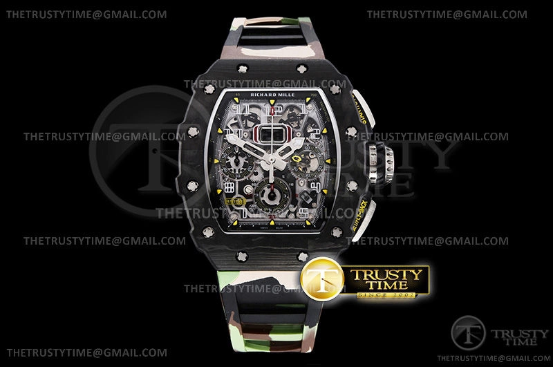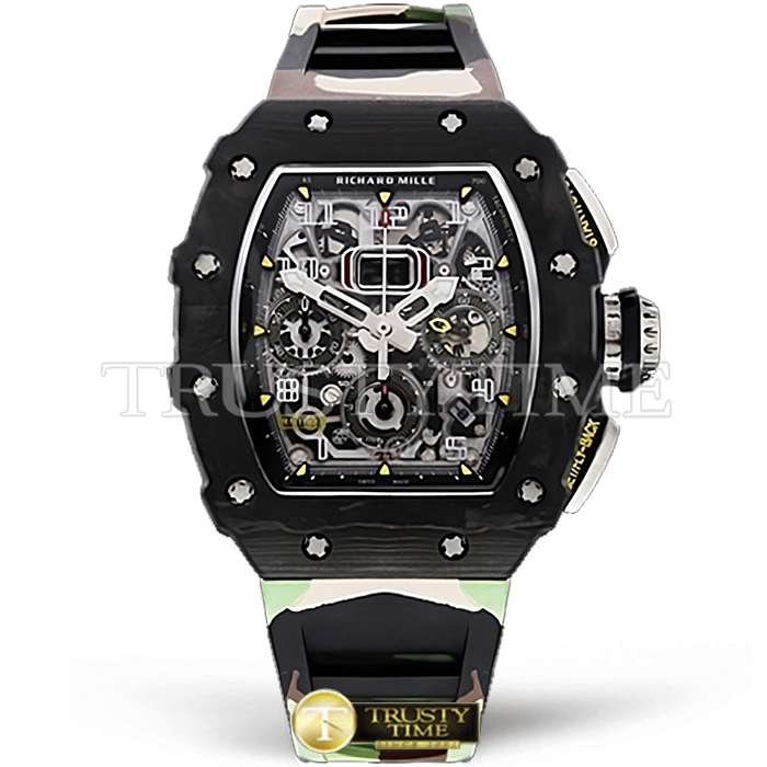 Часы Richard Mille из коллекции RM011. Спортивные мужские часы Richard Mille RM011-03 Auto Flyback Chronograph премиального качества (Артикул магазина: RM-0189) оснащены надежным автоматическим механизмом с автоподзаводом (работает от амплитуды движения руки) калибра Valjoux-7750, в котором реализованы следующие функции: часовая, минутная и секундная стрелки, а так же хронограф, дата. Бочкообразный корпус часов черного цвета, имеющий размер 43 мм и высоту 19 мм превосходно дополнит образ и украсит запястье своего обладателя. Для изготовления часов Richard Mille RM011-03 Auto Flyback Chronograph предлагаемых в нашем интернет-магазине, применяются кованый карбон высокого качества (Швейцарский стандарт), а так же сапфировое стекло высокой прочности, благодаря чему обеспечивается максимальная защита от сколов и механических повреждений. Отличительной чертой данной модели является скелетонизированный циферблат, часовые индексы которого обеспечивают часовые метки. Завершает образ каучуковый ремешок камуфляжного цвета с фирменной раскладывающейся застежкой Richard Mille. Водонепроницаемость данной модели составляет 30М (WR30) – допускается минимальное воздействие с водой.