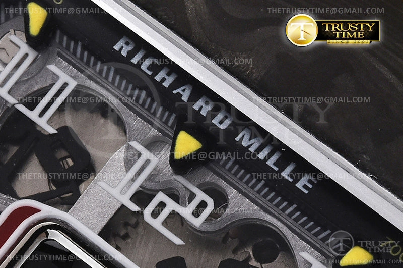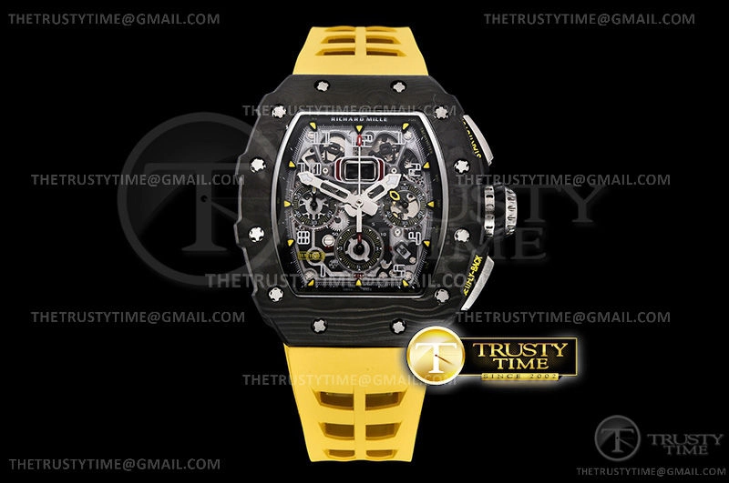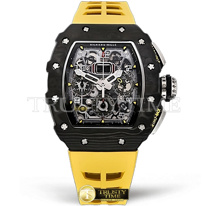 Часы Richard Mille из коллекции RM011. Спортивные мужские часы Richard Mille RM011-03 Auto Flyback Chronograph премиального качества (Артикул магазина: RM-0188) оснащены надежным автоматическим механизмом с автоподзаводом (работает от амплитуды движения руки) калибра Valjoux-7750, в котором реализованы следующие функции: часовая, минутная и секундная стрелки, а так же хронограф, дата. Бочкообразный корпус часов черного цвета, имеющий размер 43 мм и высоту 19 мм превосходно дополнит образ и украсит запястье своего обладателя. Для изготовления часов Richard Mille RM011-03 Auto Flyback Chronograph предлагаемых в нашем интернет-магазине, применяются кованый карбон высокого качества (Швейцарский стандарт), а так же сапфировое стекло высокой прочности, благодаря чему обеспечивается максимальная защита от сколов и механических повреждений. Отличительной чертой данной модели является скелетонизированный циферблат, часовые индексы которого обеспечивают часовые метки. Завершает образ каучуковый ремешок желтого цвета с фирменной раскладывающейся застежкой Richard Mille. Водонепроницаемость данной модели составляет 30М (WR30) – допускается минимальное воздействие с водой.