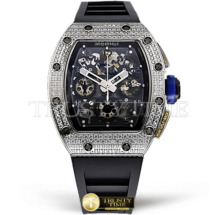 Часы Richard Mille из коллекции RM011. Спортивные мужские часы Richard Mille RM011 10th Anni Felipe Massa премиального качества (Артикул магазина: RM-0187) оснащены надежным автоматическим механизмом с автоподзаводом (работает от амплитуды движения руки) калибра Valjoux-7750, в котором реализованы следующие функции: часовая, минутная и секундная стрелки, а так же хронограф, дата. Бочкообразный корпус часов стального цвета, имеющий размер 43 мм и высоту 19 мм превосходно дополнит образ и украсит запястье своего обладателя. Для изготовления часов Richard Mille RM011 10th Anni Felipe Massa предлагаемых в нашем интернет-магазине, применяются нержавеющая сталь 316L высокого качества (Швейцарский стандарт), а так же сапфировое стекло высокой прочности, благодаря чему обеспечивается максимальная защита от сколов и механических повреждений. Отличительной чертой данной модели является скелетонизированный циферблат, часовые индексы которого обеспечивают часовые метки. Завершает образ каучуковый ремешок черного цвета с фирменной раскладывающейся застежкой Richard Mille. Водонепроницаемость данной модели составляет 30М (WR30) – допускается минимальное воздействие с водой.