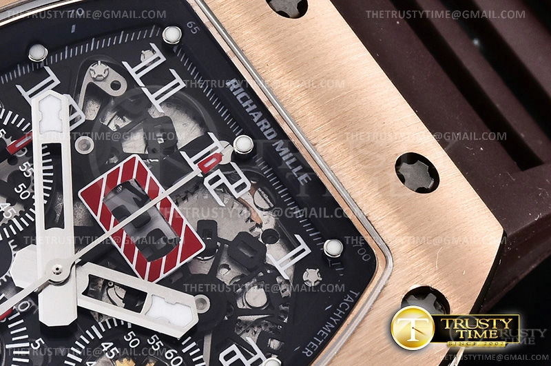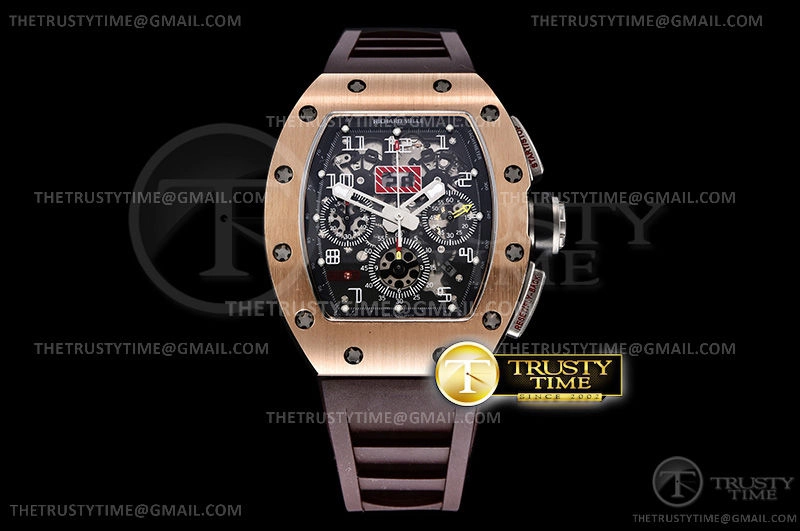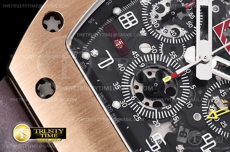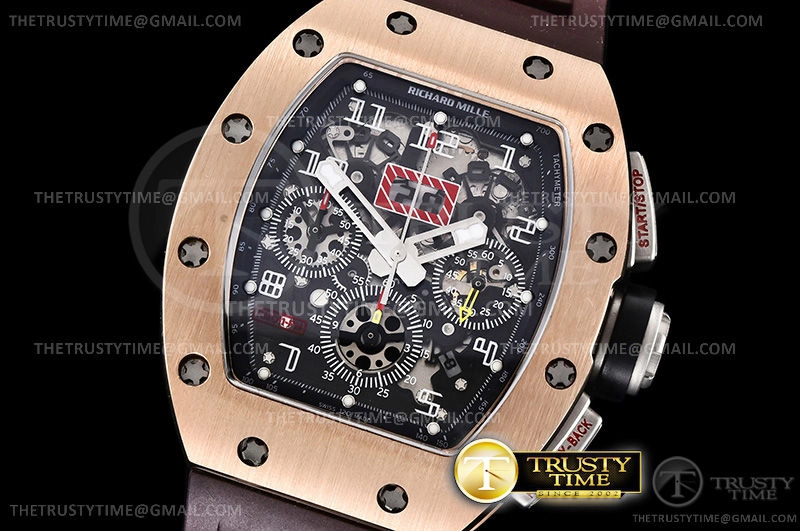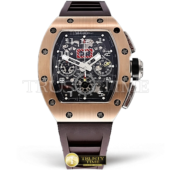 Часы Richard Mille из коллекции RM011. Спортивные мужские часы Richard Mille RM011 10th Anni Felipe Massa премиального качества (Артикул магазина: RM-0285) оснащены надежным автоматическим механизмом с автоподзаводом (работает от амплитуды движения руки) калибра Valjoux-7750, в котором реализованы следующие функции: часовая, минутная и секундная стрелки, а так же хронограф, дата. Бочкообразный корпус часов розового цвета, имеющий размер 43 мм и высоту 19 мм превосходно дополнит образ и украсит запястье своего обладателя. Для изготовления часов Richard Mille RM011 10th Anni Felipe Massa предлагаемых в нашем интернет-магазине, применяются нержавеющая сталь 316L высокого качества (Швейцарский стандарт), а так же сапфировое стекло высокой прочности, благодаря чему обеспечивается максимальная защита от сколов и механических повреждений. Отличительной чертой данной модели является скелетонизированный циферблат, часовые индексы которого обеспечивают арабские цифры. Завершает образ каучуковый ремешок коричневого цвета с фирменной раскладывающейся застежкой Richard Mille. Водонепроницаемость данной модели составляет 30М (WR30) – допускается минимальное воздействие с водой.
