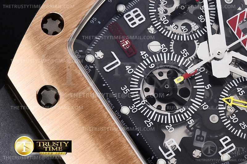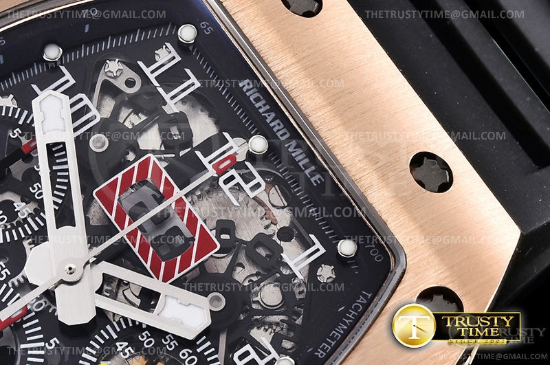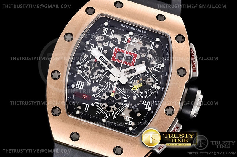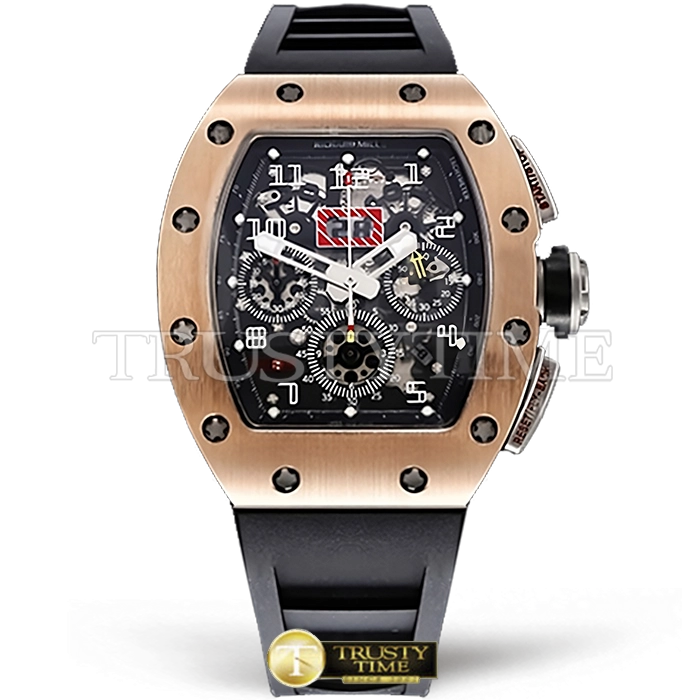 Часы Richard Mille из коллекции RM011. Спортивные мужские часы Richard Mille RM011 10th Anni Felipe Massa премиального качества (Артикул магазина: RM-0497) оснащены надежным автоматическим механизмом с автоподзаводом (работает от амплитуды движения руки) калибра Valjoux-7750, в котором реализованы следующие функции: часовая, минутная и секундная стрелки, а так же хронограф, дата. Бочкообразный корпус часов розового цвета, имеющий размер 43 мм и высоту 19 мм превосходно дополнит образ и украсит запястье своего обладателя. Для изготовления часов Richard Mille RM011 10th Anni Felipe Massa предлагаемых в нашем интернет-магазине, применяются нержавеющая сталь 316L высокого качества (Швейцарский стандарт), а так же сапфировое стекло высокой прочности, благодаря чему обеспечивается максимальная защита от сколов и механических повреждений. Отличительной чертой данной модели является скелетонизированный циферблат, часовые индексы которого обеспечивают арабские цифры. Завершает образ каучуковый ремешок черного цвета с фирменной раскладывающейся застежкой Richard Mille. Водонепроницаемость данной модели составляет 30М (WR30) – допускается минимальное воздействие с водой.