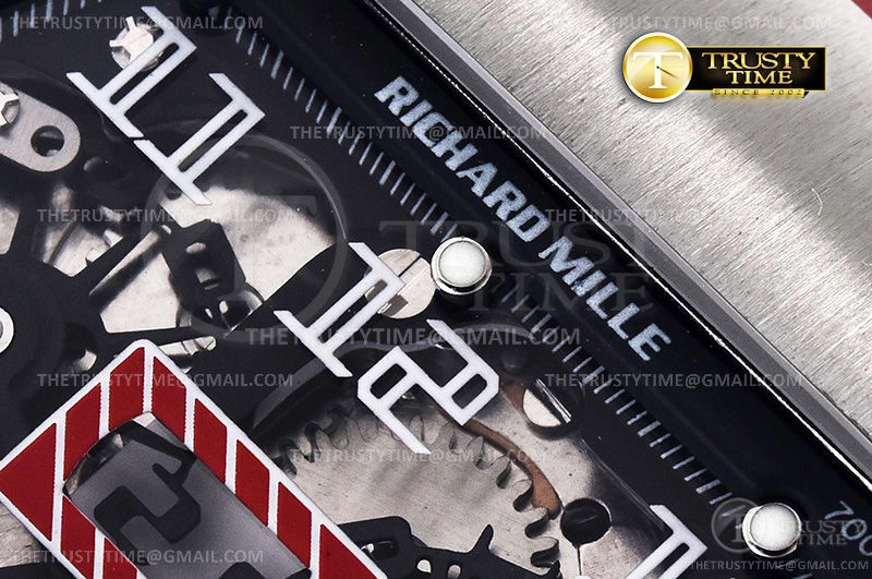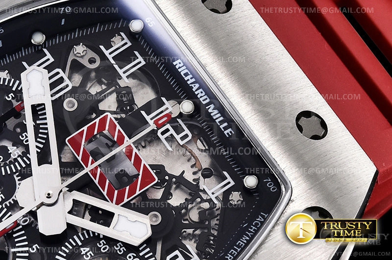 Часы Richard Mille из коллекции RM011. Спортивные мужские часы Richard Mille RM011 10th Anni Felipe Massa премиального качества (Артикул магазина: RM-0504) оснащены надежным автоматическим механизмом с автоподзаводом (работает от амплитуды движения руки) калибра Valjoux-7750, в котором реализованы следующие функции: часовая, минутная и секундная стрелки, а так же хронограф, дата. Бочкообразный корпус часов стального цвета, имеющий размер 43 мм и высоту 19 мм превосходно дополнит образ и украсит запястье своего обладателя. Для изготовления часов Richard Mille RM011 10th Anni Felipe Massa предлагаемых в нашем интернет-магазине, применяются нержавеющая сталь 316L высокого качества (Швейцарский стандарт), а так же сапфировое стекло высокой прочности, благодаря чему обеспечивается максимальная защита от сколов и механических повреждений. Отличительной чертой данной модели является скелетонизированный циферблат, часовые индексы которого обеспечивают арабские цифры. Завершает образ каучуковый ремешок красного цвета с фирменной раскладывающейся застежкой Richard Mille. Водонепроницаемость данной модели составляет 30М (WR30) – допускается минимальное воздействие с водой.