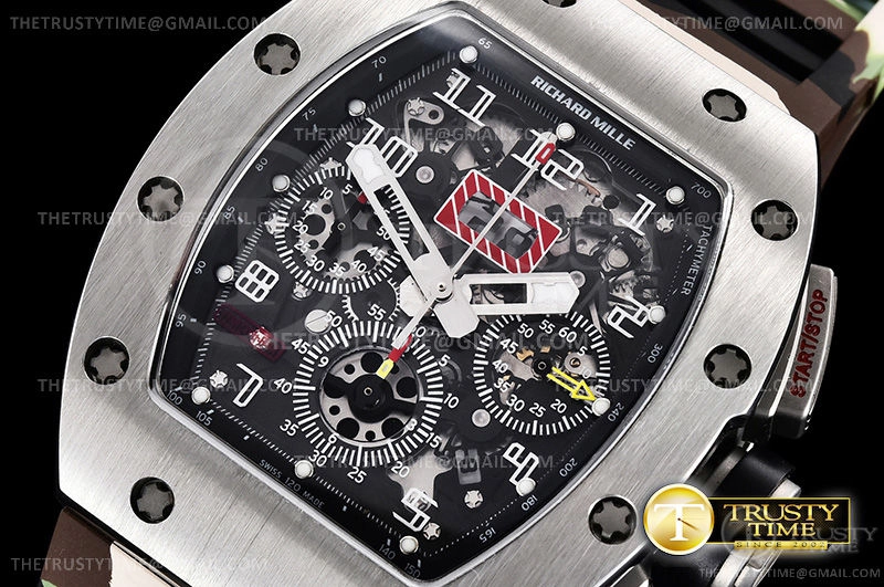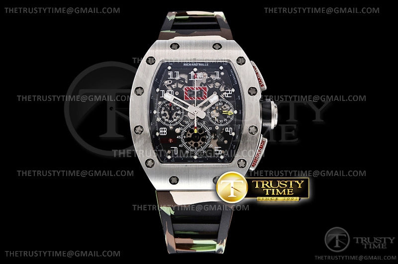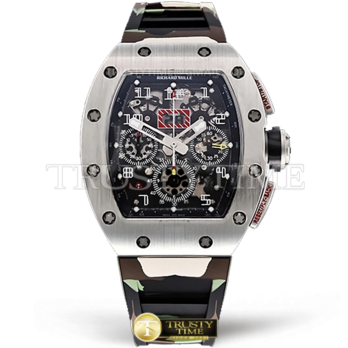 Часы Richard Mille из коллекции RM011. Спортивные мужские часы Richard Mille RM011 10th Anni Felipe Massa премиального качества (Артикул магазина: RM-0503) оснащены надежным автоматическим механизмом с автоподзаводом (работает от амплитуды движения руки) калибра Valjoux-7750, в котором реализованы следующие функции: часовая, минутная и секундная стрелки, а так же хронограф, дата. Бочкообразный корпус часов стального цвета, имеющий размер 43 мм и высоту 19 мм превосходно дополнит образ и украсит запястье своего обладателя. Для изготовления часов Richard Mille RM011 10th Anni Felipe Massa предлагаемых в нашем интернет-магазине, применяются нержавеющая сталь 316L высокого качества (Швейцарский стандарт), а так же сапфировое стекло высокой прочности, благодаря чему обеспечивается максимальная защита от сколов и механических повреждений. Отличительной чертой данной модели является скелетонизированный циферблат, часовые индексы которого обеспечивают арабские цифры. Завершает образ каучуковый ремешок камуфляжного цвета с фирменной раскладывающейся застежкой Richard Mille. Водонепроницаемость данной модели составляет 30М (WR30) – допускается минимальное воздействие с водой.