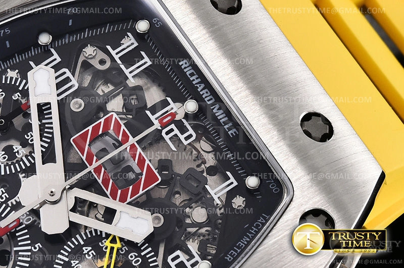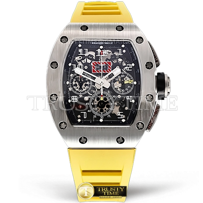 Часы Richard Mille из коллекции RM011. Спортивные мужские часы Richard Mille RM011 10th Anni Felipe Massa премиального качества (Артикул магазина: RM-0500) оснащены надежным автоматическим механизмом с автоподзаводом (работает от амплитуды движения руки) калибра Valjoux-7750, в котором реализованы следующие функции: часовая, минутная и секундная стрелки, а так же хронограф, дата. Бочкообразный корпус часов стального цвета, имеющий размер 43 мм и высоту 19 мм превосходно дополнит образ и украсит запястье своего обладателя. Для изготовления часов Richard Mille RM011 10th Anni Felipe Massa предлагаемых в нашем интернет-магазине, применяются нержавеющая сталь 316L высокого качества (Швейцарский стандарт), а так же сапфировое стекло высокой прочности, благодаря чему обеспечивается максимальная защита от сколов и механических повреждений. Отличительной чертой данной модели является скелетонизированный циферблат, часовые индексы которого обеспечивают арабские цифры. Завершает образ каучуковый ремешок желтого цвета с фирменной раскладывающейся застежкой Richard Mille. Водонепроницаемость данной модели составляет 30М (WR30) – допускается минимальное воздействие с водой.