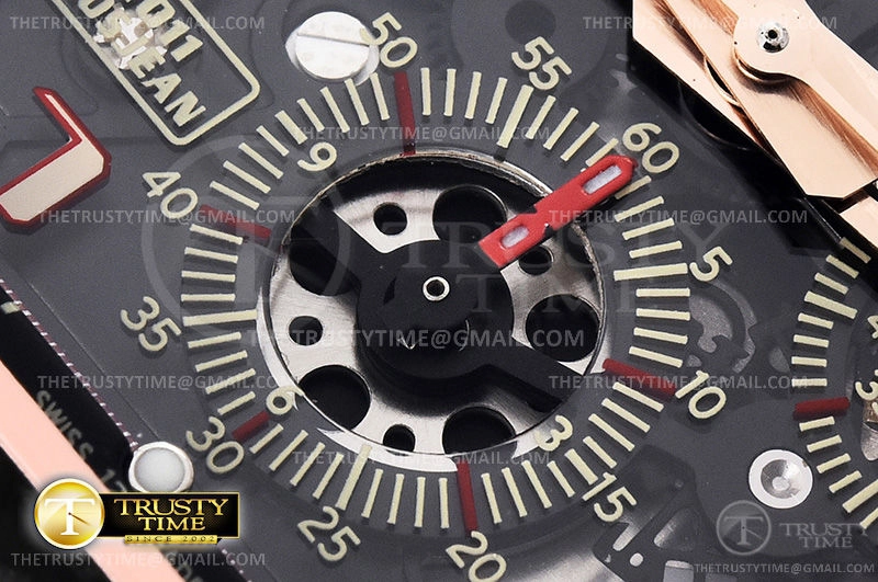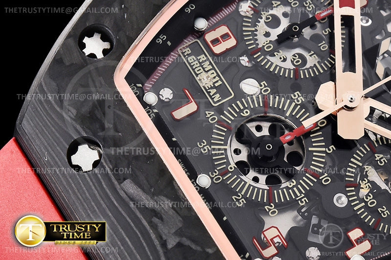 Часы Richard Mille из коллекции RM011. Спортивные мужские часы Richard Mille RM011 Lotus F1 премиального качества (Артикул магазина: RM-0506) оснащены надежным автоматическим механизмом с автоподзаводом (работает от амплитуды движения руки) калибра Valjoux-7750, в котором реализованы следующие функции: часовая, минутная и секундная стрелки, а так же хронограф, дата. Бочкообразный корпус часов черного цвета, имеющий размер 43 мм и высоту 19 мм превосходно дополнит образ и украсит запястье своего обладателя. Для изготовления часов Richard Mille RM011 Lotus F1 предлагаемых в нашем интернет-магазине, применяются кованый карбон высокого качества (Швейцарский стандарт), а так же сапфировое стекло высокой прочности, благодаря чему обеспечивается максимальная защита от сколов и механических повреждений. Отличительной чертой данной модели является скелетонизированный циферблат, часовые индексы которого обеспечивают арабские цифры. Завершает образ каучуковый ремешок красного цвета с фирменной раскладывающейся застежкой Richard Mille. Водонепроницаемость данной модели составляет 30М (WR30) – допускается минимальное воздействие с водой.
