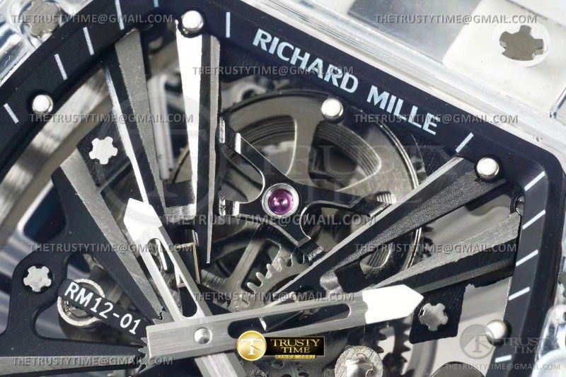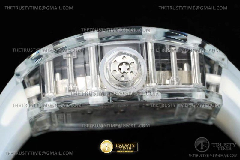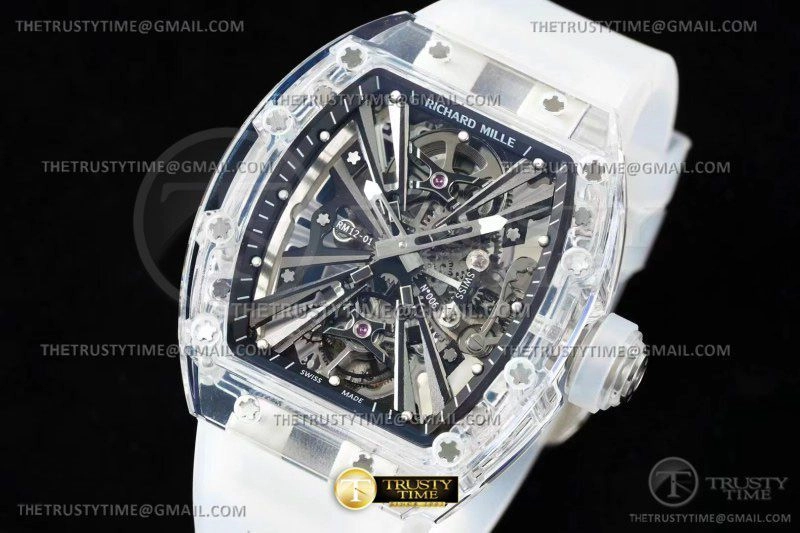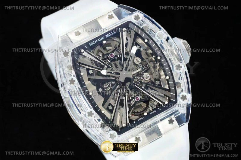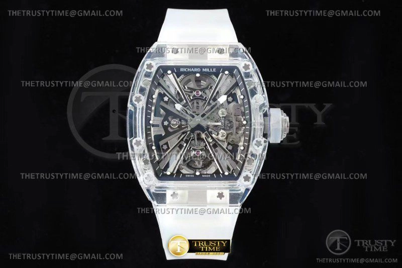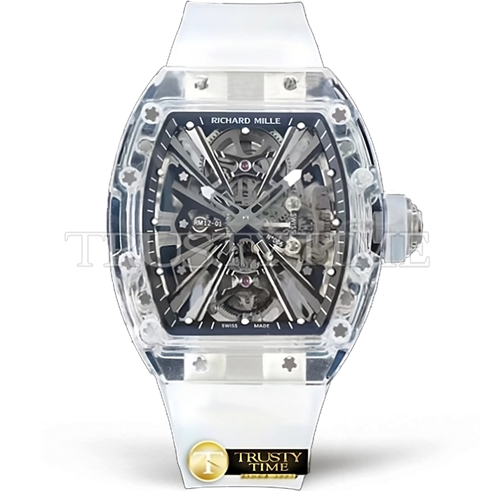 Часы Richard Mille из коллекции RM012. Классические мужские часы Richard Mille RM012-01 Tourbillon Sapphire премиального качества (Артикул магазина: RM-0547) оснащены надежным автоматическим механизмом с ручным заводом калибра Seagull Handwind Tourbillon, в котором реализованы следующие функции: часова и минутка стрелки, а так же турбийон. Бочкообразный корпус часов прозрачного цвета, имеющий размер 43 мм X 49 мм и высоту 16 мм превосходно дополнит образ и украсит запястье своего обладателя. Для изготовления часов Richard Mille RM012-01 Tourbillon Sapphire предлагаемых в нашем интернет-магазине, применяются композитный материал высокого качества (Швейцарский стандарт), а так же сапфировое стекло высокой прочности, благодаря чему обеспечивается максимальная защита от сколов и механических повреждений. Отличительной чертой данной модели является скелетонизированный циферблат, часовые индексы которого обеспечивают часовые метки. Завершает образ каучуковый ремешок белого цвета с фирменной раскладывающейся застежкой Richard Mille. Водонепроницаемость данной модели составляет 30М (WR30) – допускается минимальное воздействие с водой.