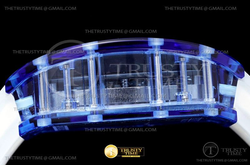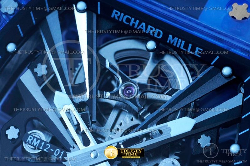 Часы Richard Mille из коллекции RM012. Классические мужские часы Richard Mille RM012-01 Tourbillon Sapphire премиального качества (Артикул магазина: RM-0551) оснащены надежным автоматическим механизмом с ручным заводом калибра Seagull Handwind Tourbillon, в котором реализованы следующие функции: часова и минутка стрелки, а так же турбийон. Бочкообразный корпус часов синего цвета, имеющий размер 43 мм X 49 мм и высоту 16 мм превосходно дополнит образ и украсит запястье своего обладателя. Для изготовления часов Richard Mille RM012-01 Tourbillon Sapphire предлагаемых в нашем интернет-магазине, применяются композитный материал высокого качества (Швейцарский стандарт), а так же сапфировое стекло высокой прочности, благодаря чему обеспечивается максимальная защита от сколов и механических повреждений. Отличительной чертой данной модели является скелетонизированный циферблат, часовые индексы которого обеспечивают часовые метки. Завершает образ каучуковый ремешок белого цвета с фирменной раскладывающейся застежкой Richard Mille. Водонепроницаемость данной модели составляет 30М (WR30) – допускается минимальное воздействие с водой.