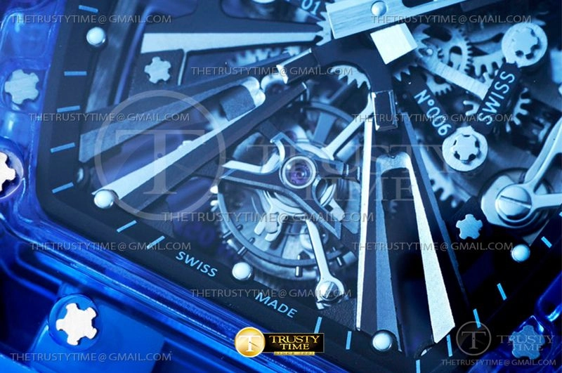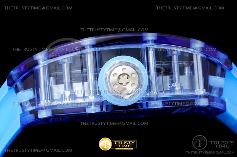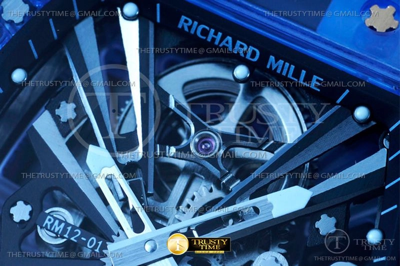 Часы Richard Mille из коллекции RM012. Классические мужские часы Richard Mille RM012-01 Tourbillon Sapphire премиального качества (Артикул магазина: RM-0552) оснащены надежным автоматическим механизмом с ручным заводом калибра Seagull Handwind Tourbillon, в котором реализованы следующие функции: часова и минутка стрелки, а так же турбийон. Бочкообразный корпус часов синего цвета, имеющий размер 43 мм X 49 мм и высоту 16 мм превосходно дополнит образ и украсит запястье своего обладателя. Для изготовления часов Richard Mille RM012-01 Tourbillon Sapphire предлагаемых в нашем интернет-магазине, применяются композитный материал высокого качества (Швейцарский стандарт), а так же сапфировое стекло высокой прочности, благодаря чему обеспечивается максимальная защита от сколов и механических повреждений. Отличительной чертой данной модели является скелетонизированный циферблат, часовые индексы которого обеспечивают часовые метки. Завершает образ каучуковый ремешок голубого цвета с фирменной раскладывающейся застежкой Richard Mille. Водонепроницаемость данной модели составляет 30М (WR30) – допускается минимальное воздействие с водой.