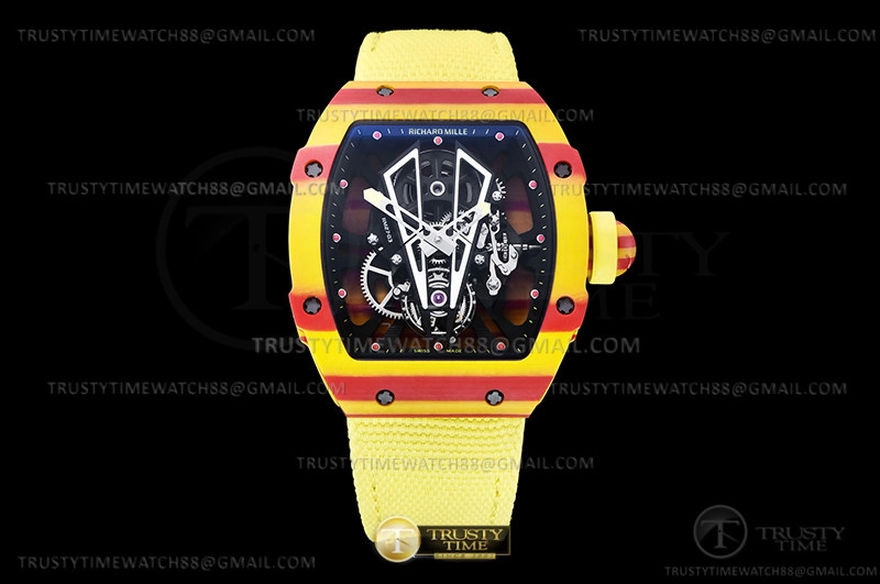 Часы Richard Mille из коллекции RM027. Спортивные мужские часы Richard Mille Rafael Nadal RM027-03 Tourbillon премиального качества (Артикул магазина: RM-0571) оснащены надежным автоматическим механизмом с ручным заводом калибра Seagull Handwind Tourbillon, в котором реализованы следующие функции: часова и минутка стрелки, а так же турбийон. Бочкообразный корпус часов желтого цвета, имеющий размер 41 мм x 48 мм и высоту 13 мм превосходно дополнит образ и украсит запястье своего обладателя. Для изготовления часов Richard Mille Rafael Nadal RM027-03 Tourbillon предлагаемых в нашем интернет-магазине, применяются карбон NTPT высокого качества (Швейцарский стандарт), а так же сапфировое стекло высокой прочности, благодаря чему обеспечивается максимальная защита от сколов и механических повреждений. Отличительной чертой данной модели является скелетонизированный циферблат, часовые индексы которого обеспечивают часовые метки. Завершает образ нейлоновый ремешок желтого цвета на липучке Richard Mille. Водонепроницаемость данной модели составляет 30М (WR30) – допускается минимальное воздействие с водой.