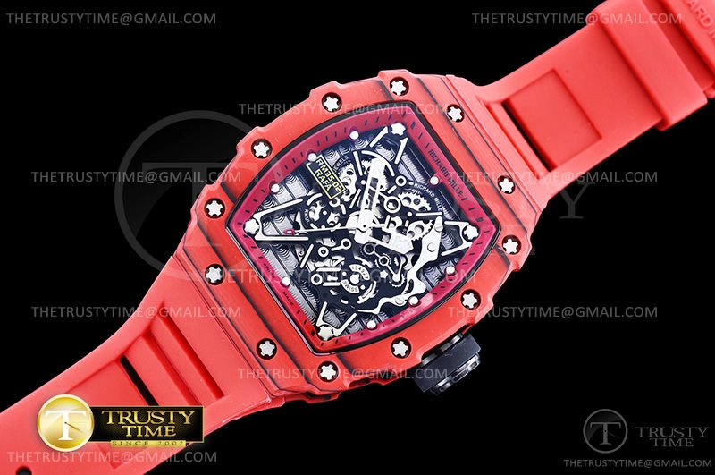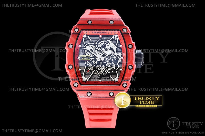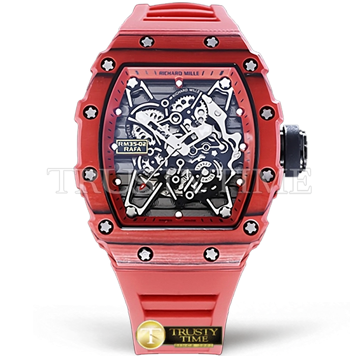 Часы Richard Mille из коллекции RM035. Спортивные мужские часы Richard Mille RM035-02 Rafael Nadal премиального качества (Артикул магазина: RM-0398) оснащены надежным автоматическим механизмом с автоподзаводом (работает от амплитуды движения руки) калибра M-6T51, в котором реализованы следующие функции: часовая, минутная и секундная стрелки, а так же максимально простой функционал без усложнений. Бочкообразный корпус часов красного цвета, имеющий размер 43 мм X 50 мм и высоту 17.5 мм превосходно дополнит образ и украсит запястье своего обладателя. Для изготовления часов Richard Mille RM035-02 Rafael Nadal предлагаемых в нашем интернет-магазине, применяются кованый карбон высокого качества (Швейцарский стандарт), а так же сапфировое стекло высокой прочности, благодаря чему обеспечивается максимальная защита от сколов и механических повреждений. Отличительной чертой данной модели является скелетонизированный циферблат, часовые индексы которого обеспечивают часовые метки. Завершает образ каучуковый ремешок красного цвета с фирменной раскладывающейся застежкой Richard Mille. Водонепроницаемость данной модели составляет 30М (WR30) – допускается минимальное воздействие с водой.