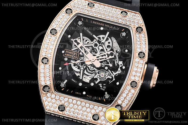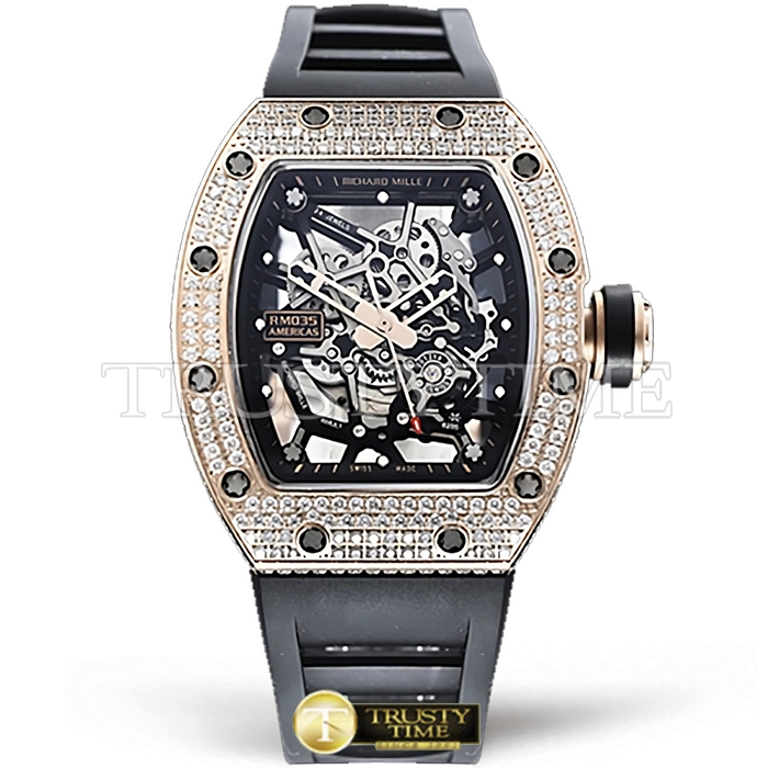 Часы Richard Mille из коллекции RM035. Спортивные мужские часы Richard Mille RM035-02 Americas Skeleton премиального качества (Артикул магазина: RM-0345) оснащены надежным автоматическим механизмом с автоподзаводом (работает от амплитуды движения руки) калибра MY8215, в котором реализованы следующие функции: часовая, минутная и секундная стрелки, а так же максимально простой функционал без усложнений. Бочкообразный корпус часов розового цвета, имеющий размер 43 мм X 50 мм и высоту 16.5 мм превосходно дополнит образ и украсит запястье своего обладателя. Для изготовления часов Richard Mille RM035-02 Americas Skeleton предлагаемых в нашем интернет-магазине, применяются нержавеющая сталь 316F высокого качества (Швейцарский стандарт), а так же сапфировое стекло высокой прочности, благодаря чему обеспечивается максимальная защита от сколов и механических повреждений. Отличительной чертой данной модели является скелетонизированный циферблат, часовые индексы которого обеспечивают часовые метки. Завершает образ каучуковый ремешок черного цвета с фирменной раскладывающейся застежкой Richard Mille. Водонепроницаемость данной модели составляет 30М (WR30) – допускается минимальное воздействие с водой.