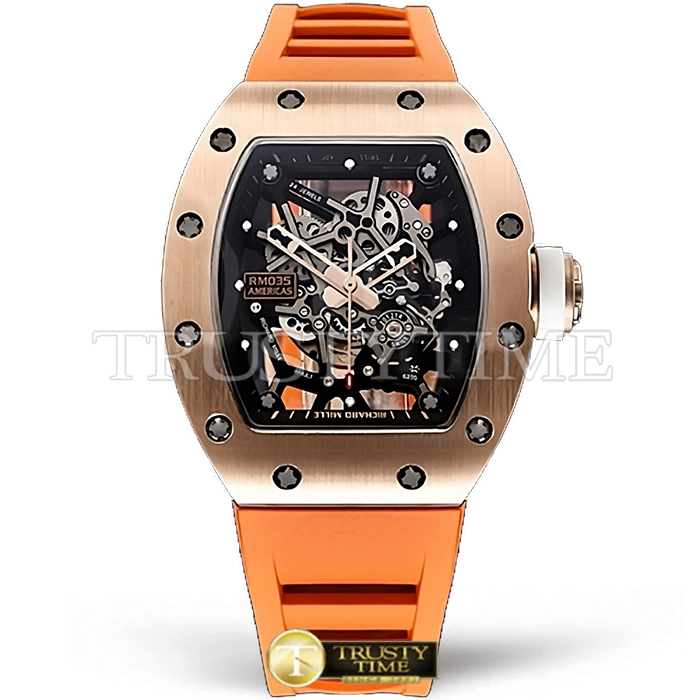 Часы Richard Mille из коллекции RM035. Спортивные мужские часы Richard Mille RM035 Americas Skeleton премиального качества (Артикул магазина: RM-0337) оснащены надежным автоматическим механизмом с автоподзаводом (работает от амплитуды движения руки) калибра MY8215, в котором реализованы следующие функции: часовая, минутная и секундная стрелки, а так же максимально простой функционал без усложнений. Бочкообразный корпус часов розового цвета, имеющий размер 43 мм X 50 мм и высоту 16.5 мм превосходно дополнит образ и украсит запястье своего обладателя. Для изготовления часов Richard Mille RM035 Americas Skeleton предлагаемых в нашем интернет-магазине, применяются нержавеющая сталь 316F высокого качества (Швейцарский стандарт), а так же сапфировое стекло высокой прочности, благодаря чему обеспечивается максимальная защита от сколов и механических повреждений. Отличительной чертой данной модели является скелетонизированный циферблат, часовые индексы которого обеспечивают часовые метки. Завершает образ каучуковый ремешок оранжевого цвета с фирменной раскладывающейся застежкой Richard Mille. Водонепроницаемость данной модели составляет 30М (WR30) – допускается минимальное воздействие с водой.