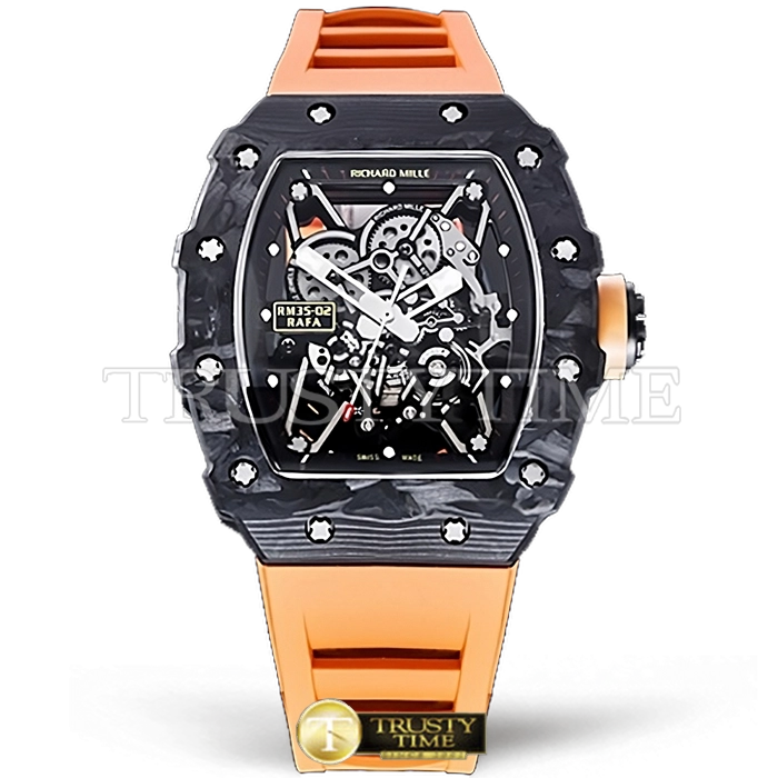 Часы Richard Mille из коллекции RM035. Спортивные мужские часы Richard Mille RM035-02 Rafael Nadal премиального качества (Артикул магазина: RM-0332) оснащены надежным автоматическим механизмом с автоподзаводом (работает от амплитуды движения руки) калибра MY8215, в котором реализованы следующие функции: часовая, минутная и секундная стрелки, а так же максимально простой функционал без усложнений. Бочкообразный корпус часов черного цвета, имеющий размер 42 мм X 50 мм и высоту 17 мм превосходно дополнит образ и украсит запястье своего обладателя. Для изготовления часов Richard Mille RM035-02 Rafael Nadal предлагаемых в нашем интернет-магазине, применяются кованый карбон высокого качества (Швейцарский стандарт), а так же сапфировое стекло высокой прочности, благодаря чему обеспечивается максимальная защита от сколов и механических повреждений. Отличительной чертой данной модели является скелетонизированный циферблат, часовые индексы которого обеспечивают часовые метки. Завершает образ каучуковый ремешок оранжевого цвета с фирменной раскладывающейся застежкой Richard Mille. Водонепроницаемость данной модели составляет 30М (WR30) – допускается минимальное воздействие с водой.