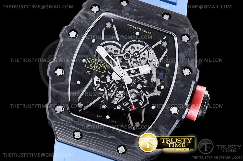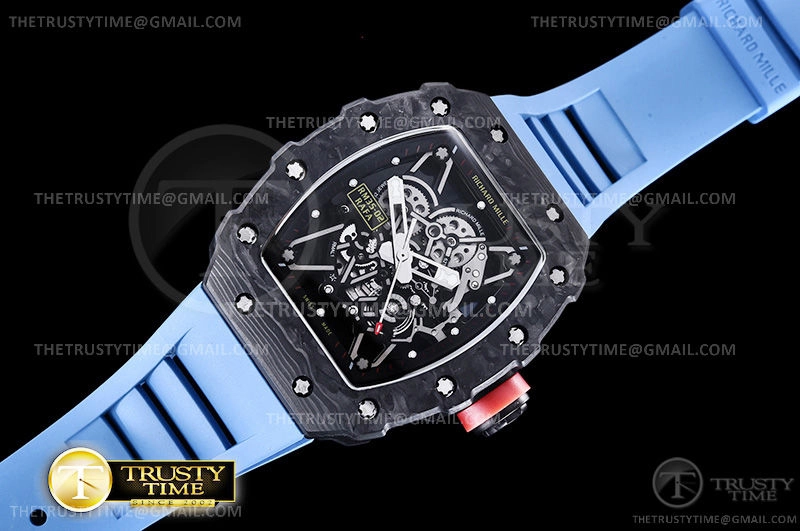 Часы Richard Mille из коллекции RM035. Спортивные мужские часы Richard Mille RM035-02 Rafael Nadal премиального качества (Артикул магазина: RM-0333) оснащены надежным автоматическим механизмом с автоподзаводом (работает от амплитуды движения руки) калибра MY8215, в котором реализованы следующие функции: часовая, минутная и секундная стрелки, а так же максимально простой функционал без усложнений. Бочкообразный корпус часов черного цвета, имеющий размер 42 мм X 50 мм и высоту 17 мм превосходно дополнит образ и украсит запястье своего обладателя. Для изготовления часов Richard Mille RM035-02 Rafael Nadal предлагаемых в нашем интернет-магазине, применяются кованый карбон высокого качества (Швейцарский стандарт), а так же сапфировое стекло высокой прочности, благодаря чему обеспечивается максимальная защита от сколов и механических повреждений. Отличительной чертой данной модели является скелетонизированный циферблат, часовые индексы которого обеспечивают часовые метки. Завершает образ каучуковый ремешок голубого цвета с фирменной раскладывающейся застежкой Richard Mille. Водонепроницаемость данной модели составляет 30М (WR30) – допускается минимальное воздействие с водой.