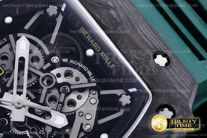Часы Richard Mille из коллекции RM035. Спортивные мужские часы Richard Mille RM035-01 Rafael Nadal премиального качества (Артикул магазина: RM-0319) оснащены надежным автоматическим механизмом с автоподзаводом (работает от амплитуды движения руки) калибра MY8215, в котором реализованы следующие функции: часовая, минутная и секундная стрелки, а так же максимально простой функционал без усложнений. Бочкообразный корпус часов черного цвета, имеющий размер 42 мм X 50 мм и высоту 17 мм превосходно дополнит образ и украсит запястье своего обладателя. Для изготовления часов Richard Mille RM035-01 Rafael Nadal предлагаемых в нашем интернет-магазине, применяются кованый карбон высокого качества (Швейцарский стандарт), а так же сапфировое стекло высокой прочности, благодаря чему обеспечивается максимальная защита от сколов и механических повреждений. Отличительной чертой данной модели является скелетонизированный циферблат, часовые индексы которого обеспечивают часовые метки. Завершает образ каучуковый ремешок зеленого цвета с фирменной раскладывающейся застежкой Richard Mille. Водонепроницаемость данной модели составляет 30М (WR30) – допускается минимальное воздействие с водой.
