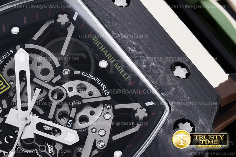 Часы Richard Mille из коллекции RM035. Спортивные мужские часы Richard Mille RM035-01 Rafael Nadal премиального качества (Артикул магазина: RM-0324) оснащены надежным автоматическим механизмом с автоподзаводом (работает от амплитуды движения руки) калибра MY8215, в котором реализованы следующие функции: часовая, минутная и секундная стрелки, а так же максимально простой функционал без усложнений. Бочкообразный корпус часов черного цвета, имеющий размер 42 мм X 50 мм и высоту 17 мм превосходно дополнит образ и украсит запястье своего обладателя. Для изготовления часов Richard Mille RM035-01 Rafael Nadal предлагаемых в нашем интернет-магазине, применяются кованый карбон высокого качества (Швейцарский стандарт), а так же сапфировое стекло высокой прочности, благодаря чему обеспечивается максимальная защита от сколов и механических повреждений. Отличительной чертой данной модели является скелетонизированный циферблат, часовые индексы которого обеспечивают часовые метки. Завершает образ каучуковый ремешок камуфляжного цвета с фирменной раскладывающейся застежкой Richard Mille. Водонепроницаемость данной модели составляет 30М (WR30) – допускается минимальное воздействие с водой.