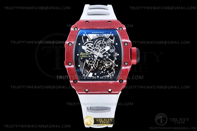 Часы Richard Mille из коллекции RM035. Спортивные мужские часы Richard Mille RM035-02 Rafael Nadal премиального качества (Артикул магазина: RM-0572) оснащены надежным автоматическим механизмом с ручным заводом калибра RMUL2, в котором реализованы следующие функции: часовая, минутная и секундная стрелки, а так же максимально простой функционал без усложнений. Бочкообразный корпус часов красного цвета, имеющий размер 50 мм x 44.5 мм и высоту 14 мм превосходно дополнит образ и украсит запястье своего обладателя. Для изготовления часов Richard Mille RM035-02 Rafael Nadal предлагаемых в нашем интернет-магазине, применяются карбон NTPT высокого качества (Швейцарский стандарт), а так же сапфировое стекло высокой прочности, благодаря чему обеспечивается максимальная защита от сколов и механических повреждений. Отличительной чертой данной модели является скелетонизированный циферблат, часовые индексы которого обеспечивают часовые метки. Завершает образ каучуковый ремешок белого цвета с фирменной раскладывающейся застежкой Richard Mille. Водонепроницаемость данной модели составляет 30М (WR30) – допускается минимальное воздействие с водой.