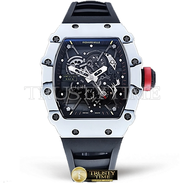Часы Richard Mille из коллекции RM035. Спортивные мужские часы Richard Mille RM035-01 Rafael Nadal премиального качества (Артикул магазина: RM-0576) оснащены надежным автоматическим механизмом с ручным заводом калибра RMUL3, в котором реализованы следующие функции: часовая, минутная и секундная стрелки, а так же максимально простой функционал без усложнений. Бочкообразный корпус часов белого цвета, имеющий размер 50 мм x 43 мм и высоту 14 мм превосходно дополнит образ и украсит запястье своего обладателя. Для изготовления часов Richard Mille RM035-01 Rafael Nadal предлагаемых в нашем интернет-магазине, применяются карбон NTPT высокого качества (Швейцарский стандарт), а так же сапфировое стекло высокой прочности, благодаря чему обеспечивается максимальная защита от сколов и механических повреждений. Отличительной чертой данной модели является скелетонизированный циферблат, часовые индексы которого обеспечивают часовые метки. Завершает образ каучуковый ремешок черного цвета с фирменной раскладывающейся застежкой Richard Mille. Водонепроницаемость данной модели составляет 30М (WR30) – допускается минимальное воздействие с водой.