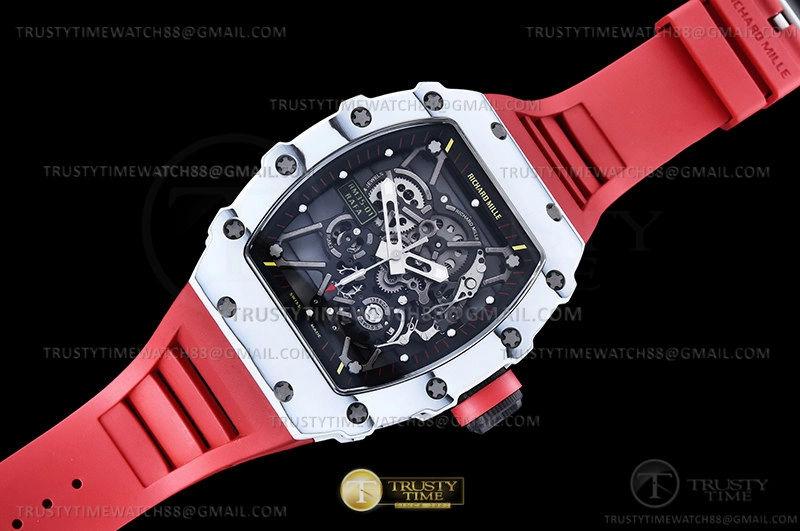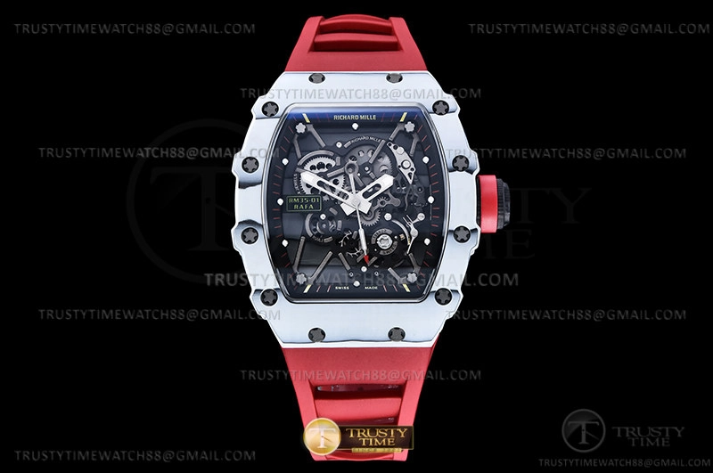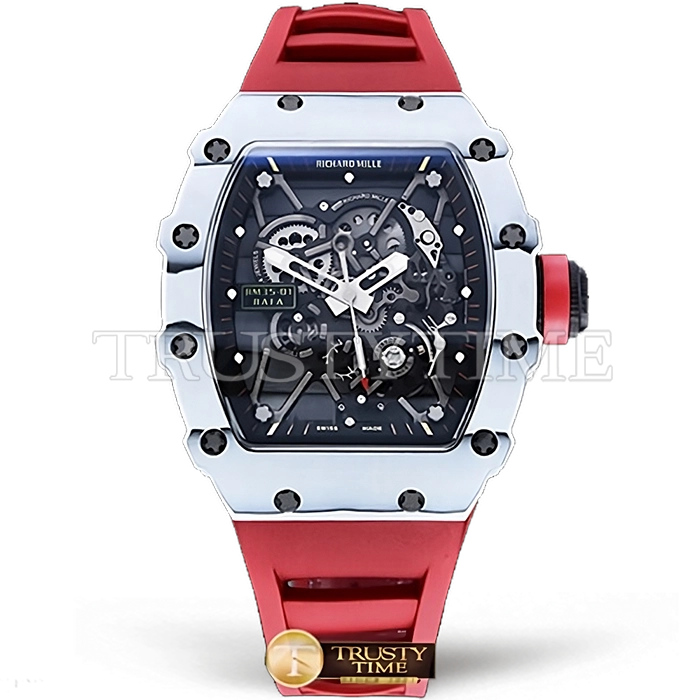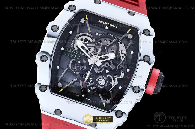 Часы Richard Mille из коллекции RM035. Спортивные мужские часы Richard Mille RM035-01 Rafael Nadal премиального качества (Артикул магазина: RM-0578) оснащены надежным автоматическим механизмом с ручным заводом калибра RMUL3, в котором реализованы следующие функции: часовая, минутная и секундная стрелки, а так же максимально простой функционал без усложнений. Бочкообразный корпус часов белого цвета, имеющий размер 50 мм x 43 мм и высоту 14 мм превосходно дополнит образ и украсит запястье своего обладателя. Для изготовления часов Richard Mille RM035-01 Rafael Nadal предлагаемых в нашем интернет-магазине, применяются карбон NTPT высокого качества (Швейцарский стандарт), а так же сапфировое стекло высокой прочности, благодаря чему обеспечивается максимальная защита от сколов и механических повреждений. Отличительной чертой данной модели является скелетонизированный циферблат, часовые индексы которого обеспечивают часовые метки. Завершает образ каучуковый ремешок красного цвета с фирменной раскладывающейся застежкой Richard Mille. Водонепроницаемость данной модели составляет 30М (WR30) – допускается минимальное воздействие с водой.