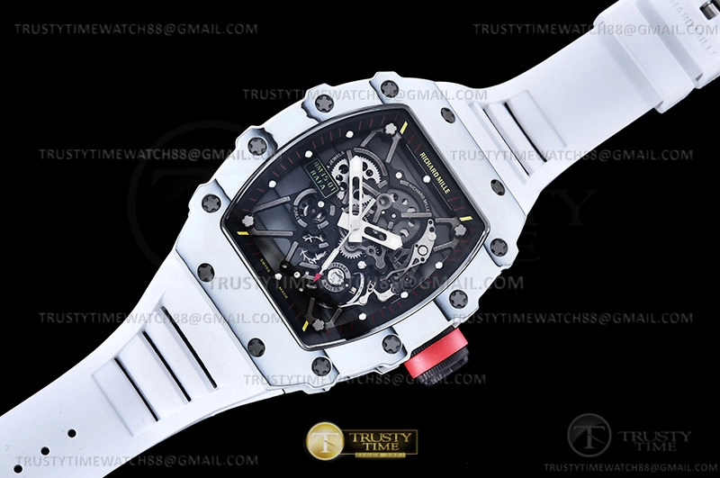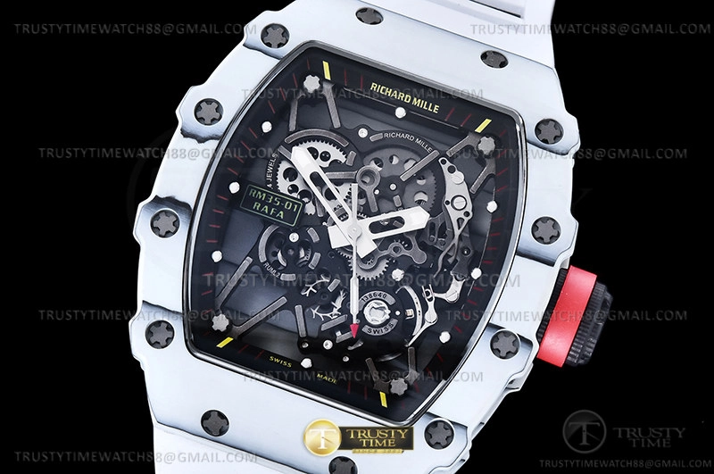 Часы Richard Mille из коллекции RM035. Спортивные мужские часы Richard Mille RM035-01 Rafael Nadal премиального качества (Артикул магазина: RM-0580) оснащены надежным автоматическим механизмом с ручным заводом калибра RMUL3, в котором реализованы следующие функции: часовая, минутная и секундная стрелки, а так же максимально простой функционал без усложнений. Бочкообразный корпус часов белого цвета, имеющий размер 50 мм x 43 мм и высоту 14 мм превосходно дополнит образ и украсит запястье своего обладателя. Для изготовления часов Richard Mille RM035-01 Rafael Nadal предлагаемых в нашем интернет-магазине, применяются карбон NTPT высокого качества (Швейцарский стандарт), а так же сапфировое стекло высокой прочности, благодаря чему обеспечивается максимальная защита от сколов и механических повреждений. Отличительной чертой данной модели является скелетонизированный циферблат, часовые индексы которого обеспечивают часовые метки. Завершает образ каучуковый ремешок белого цвета с фирменной раскладывающейся застежкой Richard Mille. Водонепроницаемость данной модели составляет 30М (WR30) – допускается минимальное воздействие с водой.