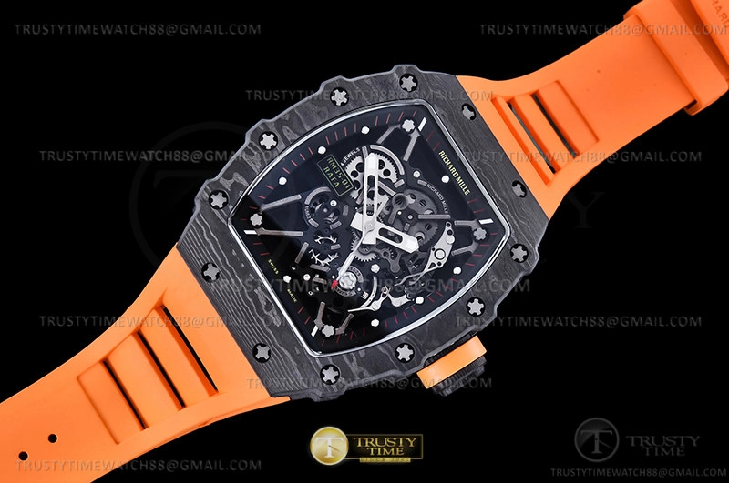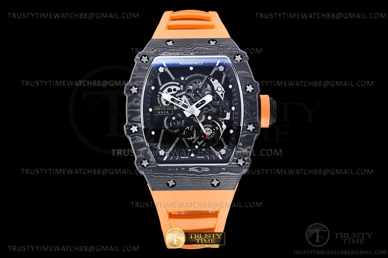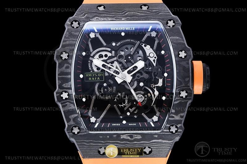 Часы Richard Mille из коллекции RM035. Спортивные мужские часы Richard Mille RM035-01 Rafael Nadal премиального качества (Артикул магазина: RM-0582) оснащены надежным автоматическим механизмом с ручным заводом калибра RMUL3, в котором реализованы следующие функции: часовая, минутная и секундная стрелки, а так же максимально простой функционал без усложнений. Бочкообразный корпус часов черного цвета, имеющий размер 50 мм x 43 мм и высоту 14 мм превосходно дополнит образ и украсит запястье своего обладателя. Для изготовления часов Richard Mille RM035-01 Rafael Nadal предлагаемых в нашем интернет-магазине, применяются карбон NTPT высокого качества (Швейцарский стандарт), а так же сапфировое стекло высокой прочности, благодаря чему обеспечивается максимальная защита от сколов и механических повреждений. Отличительной чертой данной модели является скелетонизированный циферблат, часовые индексы которого обеспечивают часовые метки. Завершает образ каучуковый ремешок оранжевого цвета с фирменной раскладывающейся застежкой Richard Mille. Водонепроницаемость данной модели составляет 30М (WR30) – допускается минимальное воздействие с водой.