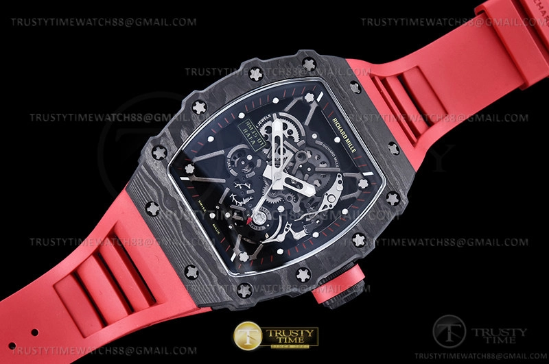 Часы Richard Mille из коллекции RM035. Спортивные мужские часы Richard Mille RM035-01 Rafael Nadal премиального качества (Артикул магазина: RM-0583) оснащены надежным автоматическим механизмом с ручным заводом калибра RMUL3, в котором реализованы следующие функции: часовая, минутная и секундная стрелки, а так же максимально простой функционал без усложнений. Бочкообразный корпус часов черного цвета, имеющий размер 50 мм x 43 мм и высоту 14 мм превосходно дополнит образ и украсит запястье своего обладателя. Для изготовления часов Richard Mille RM035-01 Rafael Nadal предлагаемых в нашем интернет-магазине, применяются карбон NTPT высокого качества (Швейцарский стандарт), а так же сапфировое стекло высокой прочности, благодаря чему обеспечивается максимальная защита от сколов и механических повреждений. Отличительной чертой данной модели является скелетонизированный циферблат, часовые индексы которого обеспечивают часовые метки. Завершает образ каучуковый ремешок красного цвета с фирменной раскладывающейся застежкой Richard Mille. Водонепроницаемость данной модели составляет 30М (WR30) – допускается минимальное воздействие с водой.