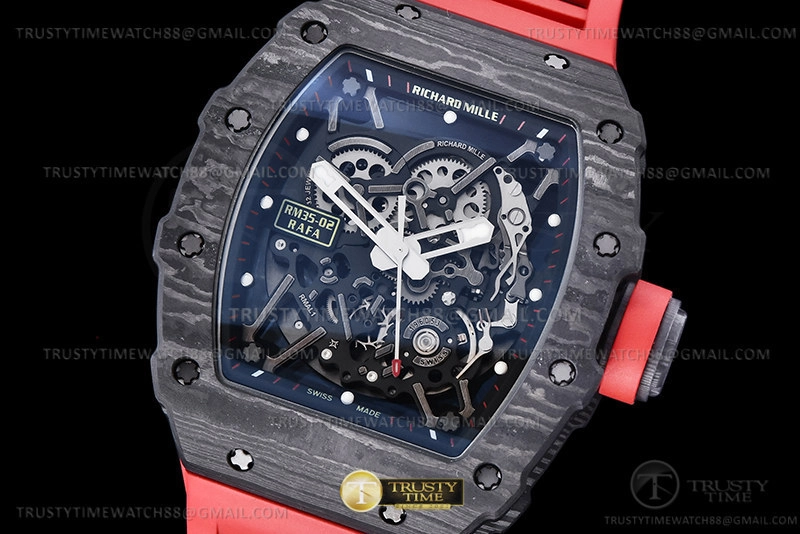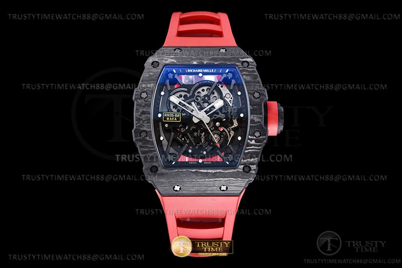 Часы Richard Mille из коллекции RM035-02. Спортивные мужские часы Richard Mille RM035-02 Rafael Nadal премиального качества (Артикул магазина: RM-0591) оснащены надежным автоматическим механизмом с автоподзаводом (работает от амплитуды движения руки) калибра RMAL1, в котором реализованы следующие функции: часовая, минутная и секундная стрелки, а так же максимально простой функционал без усложнений. Бочкообразный корпус часов черного цвета, имеющий размер 50 мм x 44.5 мм и высоту 14 мм превосходно дополнит образ и украсит запястье своего обладателя. Для изготовления часов Richard Mille RM035-02 Rafael Nadal предлагаемых в нашем интернет-магазине, применяются карбон NTPT высокого качества (Швейцарский стандарт), а так же сапфировое стекло высокой прочности, благодаря чему обеспечивается максимальная защита от сколов и механических повреждений. Отличительной чертой данной модели является скелетонизированный циферблат, часовые индексы которого обеспечивают часовые метки. Завершает образ каучуковый ремешок красного цвета с фирменной раскладывающейся застежкой Richard Mille. Водонепроницаемость данной модели составляет 30М (WR30) – допускается минимальное воздействие с водой.