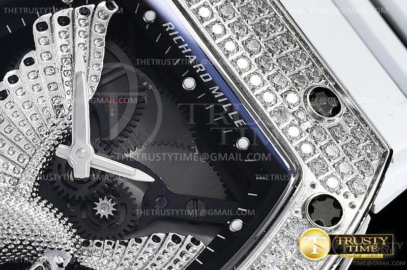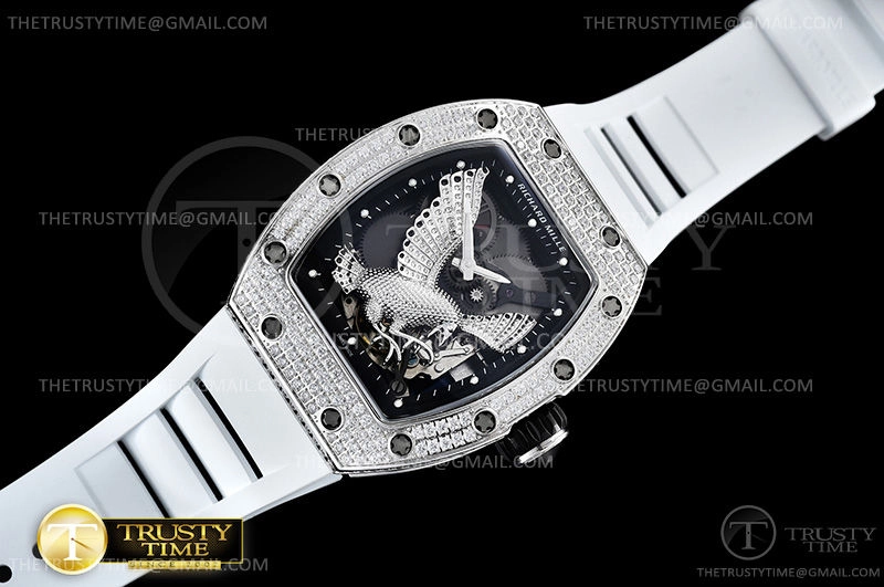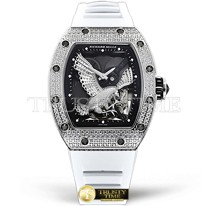 Часы Richard Mille из коллекции RM051. Спортивные мужские часы Richard Mille RM051-01 Eagle премиального качества (Артикул магазина: RM-0416) оснащены надежным автоматическим механизмом с автоподзаводом (работает от амплитуды движения руки) калибра MY8215, в котором реализованы следующие функции: часова и минутка стрелки, а так же максимально простой функционал без усложнений. Бочкообразный корпус часов стального цвета, имеющий размер 43 мм X 51 мм и высоту 17 мм превосходно дополнит образ и украсит запястье своего обладателя. Для изготовления часов Richard Mille RM051-01 Eagle предлагаемых в нашем интернет-магазине, применяются нержавеющая сталь 316L высокого качества (Швейцарский стандарт), а так же сапфировое стекло высокой прочности, благодаря чему обеспечивается максимальная защита от сколов и механических повреждений. Отличительной чертой данной модели является черный циферблат, часовые индексы которого обеспечивают часовые метки. Завершает образ каучуковый ремешок белого цвета с фирменной раскладывающейся застежкой Richard Mille. Водонепроницаемость данной модели составляет 30М (WR30) – допускается минимальное воздействие с водой.
