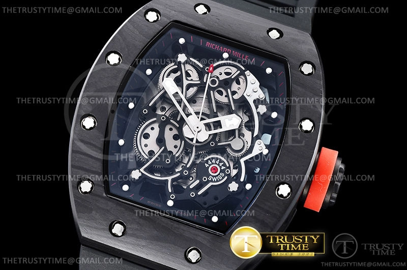 Часы Richard Mille из коллекции RM055. Спортивные мужские часы Richard Mille RM055 Bubba Watson премиального качества (Артикул магазина: RM-0531) оснащены надежным автоматическим механизмом с автоподзаводом (работает от амплитуды движения руки) калибра MY9015, в котором реализованы следующие функции: часовая, минутная и секундная стрелки, а так же максимально простой функционал без усложнений. Бочкообразный корпус часов черного цвета, имеющий размер 43 мм и высоту 17.5 мм превосходно дополнит образ и украсит запястье своего обладателя. Для изготовления часов Richard Mille RM055 Bubba Watson предлагаемых в нашем интернет-магазине, применяются кованый карбон высокого качества (Швейцарский стандарт), а так же сапфировое стекло высокой прочности, благодаря чему обеспечивается максимальная защита от сколов и механических повреждений. Отличительной чертой данной модели является скелетонизированный циферблат, часовые индексы которого обеспечивают часовые метки. Завершает образ каучуковый ремешок черного цвета с фирменной раскладывающейся застежкой Richard Mille. Водонепроницаемость данной модели составляет 30М (WR30) – допускается минимальное воздействие с водой.