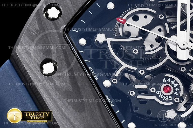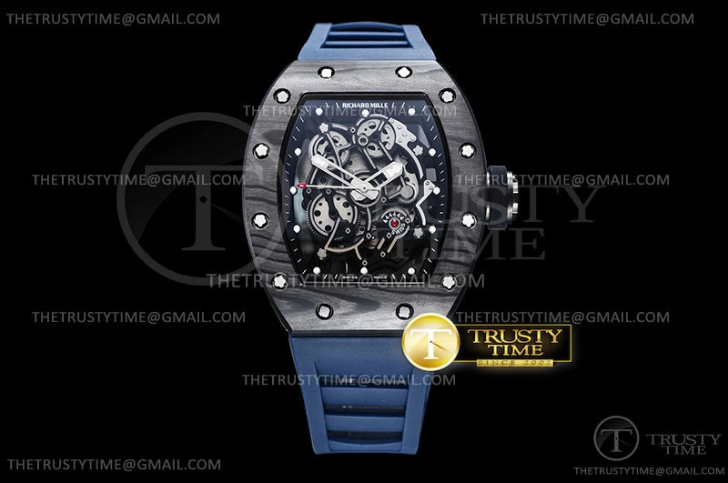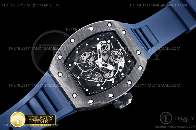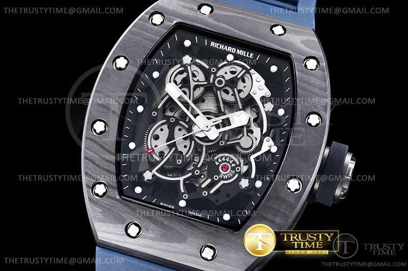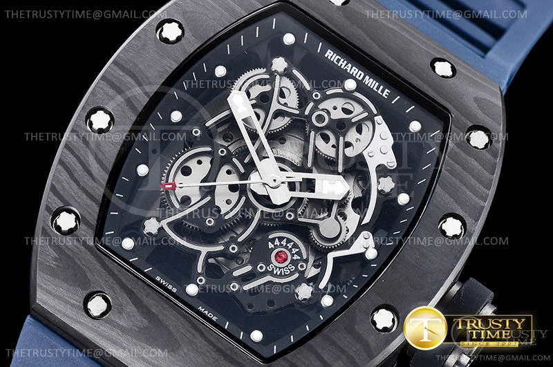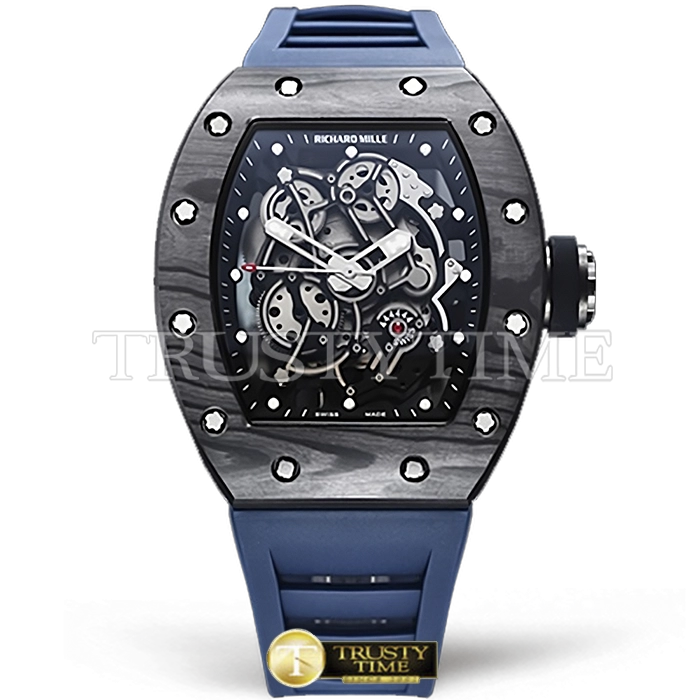 Часы Richard Mille из коллекции RM055. Спортивные мужские часы Richard Mille RM055 Bubba Watson премиального качества (Артикул магазина: RM-0466) оснащены надежным автоматическим механизмом с автоподзаводом (работает от амплитуды движения руки) калибра MY9015, в котором реализованы следующие функции: часовая, минутная и секундная стрелки, а так же максимально простой функционал без усложнений. Бочкообразный корпус часов черного цвета, имеющий размер 43 мм и высоту 17.5 мм превосходно дополнит образ и украсит запястье своего обладателя. Для изготовления часов Richard Mille RM055 Bubba Watson предлагаемых в нашем интернет-магазине, применяются кованый карбон высокого качества (Швейцарский стандарт), а так же сапфировое стекло высокой прочности, благодаря чему обеспечивается максимальная защита от сколов и механических повреждений. Отличительной чертой данной модели является скелетонизированный циферблат, часовые индексы которого обеспечивают часовые метки. Завершает образ каучуковый ремешок синего цвета с фирменной раскладывающейся застежкой Richard Mille. Водонепроницаемость данной модели составляет 30М (WR30) – допускается минимальное воздействие с водой.