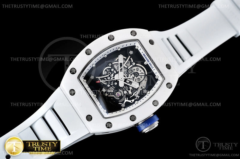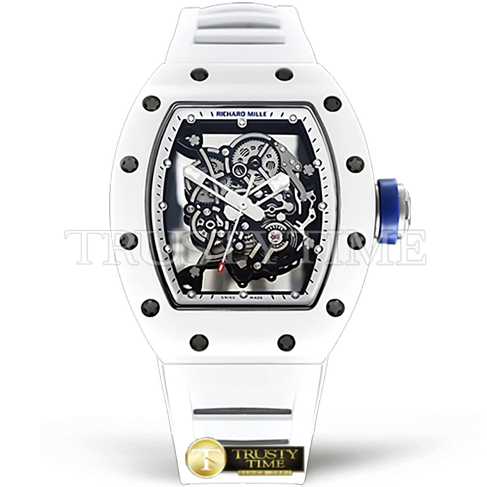 Часы Richard Mille из коллекции RM055. Спортивные мужские часы Richard Mille RM055 Bubba Watson премиального качества (Артикул магазина: RM-0461) оснащены надежным автоматическим механизмом с автоподзаводом (работает от амплитуды движения руки) калибра MY8215, в котором реализованы следующие функции: часовая, минутная и секундная стрелки, а так же максимально простой функционал без усложнений. Бочкообразный корпус часов белого цвета, имеющий размер 42 мм и высоту 17 мм превосходно дополнит образ и украсит запястье своего обладателя. Для изготовления часов Richard Mille RM055 Bubba Watson предлагаемых в нашем интернет-магазине, применяются керамика высокого качества (Швейцарский стандарт), а так же сапфировое стекло высокой прочности, благодаря чему обеспечивается максимальная защита от сколов и механических повреждений. Отличительной чертой данной модели является скелетонизированный циферблат, часовые индексы которого обеспечивают часовые метки. Завершает образ каучуковый ремешок белого цвета с фирменной раскладывающейся застежкой Richard Mille. Водонепроницаемость данной модели составляет 30М (WR30) – допускается минимальное воздействие с водой.