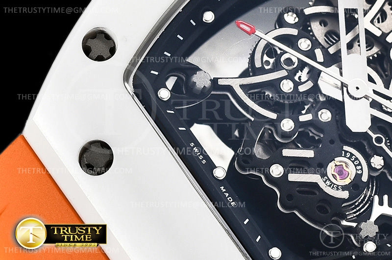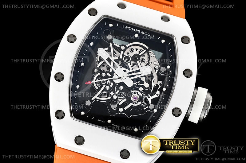 Часы Richard Mille из коллекции RM055. Спортивные мужские часы Richard Mille RM055 Bubba Watson премиального качества (Артикул магазина: RM-0449) оснащены надежным автоматическим механизмом с автоподзаводом (работает от амплитуды движения руки) калибра MY8215, в котором реализованы следующие функции: часовая, минутная и секундная стрелки, а так же максимально простой функционал без усложнений. Бочкообразный корпус часов белого цвета, имеющий размер 42 мм и высоту 17 мм превосходно дополнит образ и украсит запястье своего обладателя. Для изготовления часов Richard Mille RM055 Bubba Watson предлагаемых в нашем интернет-магазине, применяются керамика высокого качества (Швейцарский стандарт), а так же сапфировое стекло высокой прочности, благодаря чему обеспечивается максимальная защита от сколов и механических повреждений. Отличительной чертой данной модели является скелетонизированный циферблат, часовые индексы которого обеспечивают часовые метки. Завершает образ каучуковый ремешок оранжевого цвета с фирменной раскладывающейся застежкой Richard Mille. Водонепроницаемость данной модели составляет 30М (WR30) – допускается минимальное воздействие с водой.