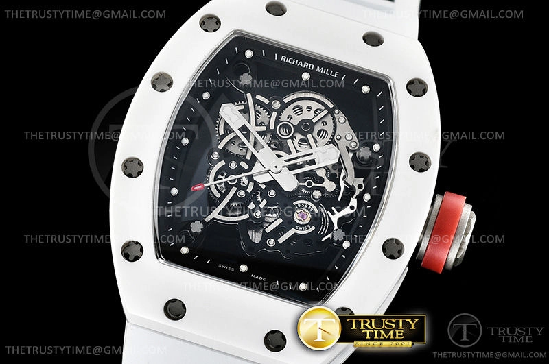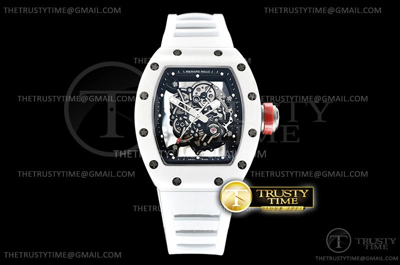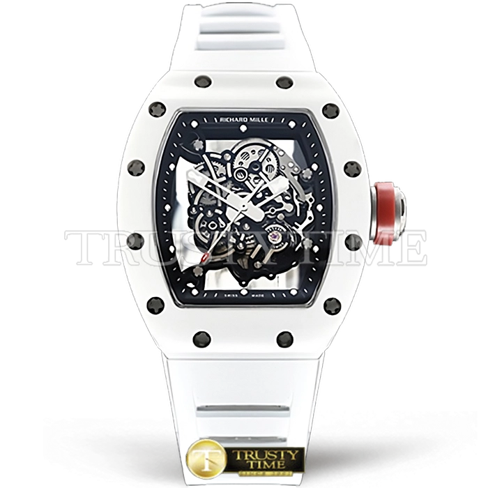 Часы Richard Mille из коллекции RM055. Спортивные мужские часы Richard Mille RM055 Bubba Watson премиального качества (Артикул магазина: RM-0450) оснащены надежным автоматическим механизмом с автоподзаводом (работает от амплитуды движения руки) калибра MY8215, в котором реализованы следующие функции: часовая, минутная и секундная стрелки, а так же максимально простой функционал без усложнений. Бочкообразный корпус часов белого цвета, имеющий размер 42 мм и высоту 17 мм превосходно дополнит образ и украсит запястье своего обладателя. Для изготовления часов Richard Mille RM055 Bubba Watson предлагаемых в нашем интернет-магазине, применяются керамика высокого качества (Швейцарский стандарт), а так же сапфировое стекло высокой прочности, благодаря чему обеспечивается максимальная защита от сколов и механических повреждений. Отличительной чертой данной модели является скелетонизированный циферблат, часовые индексы которого обеспечивают часовые метки. Завершает образ каучуковый ремешок белого цвета с фирменной раскладывающейся застежкой Richard Mille. Водонепроницаемость данной модели составляет 30М (WR30) – допускается минимальное воздействие с водой.