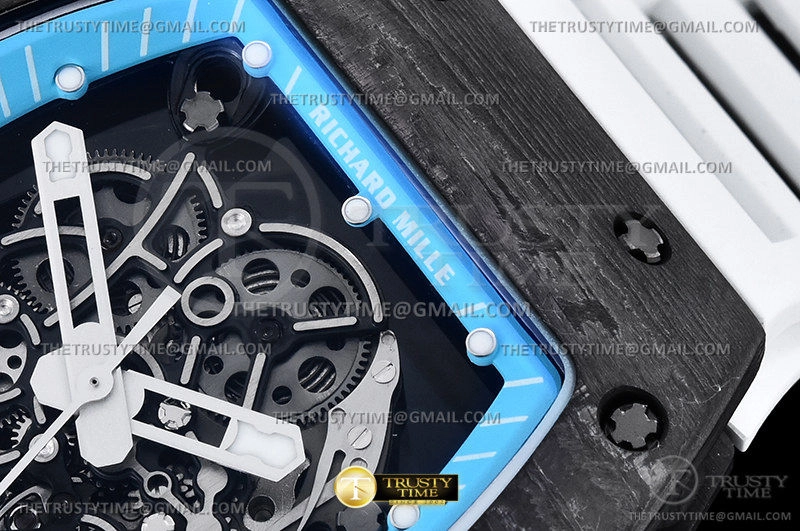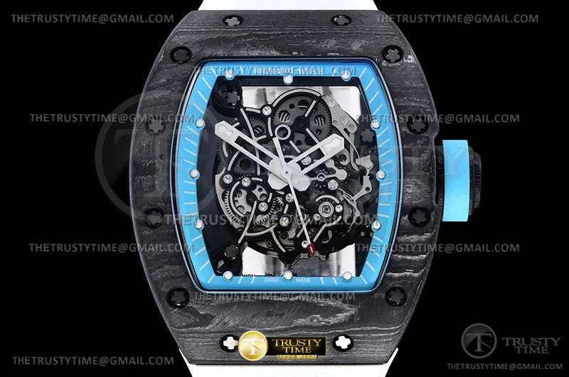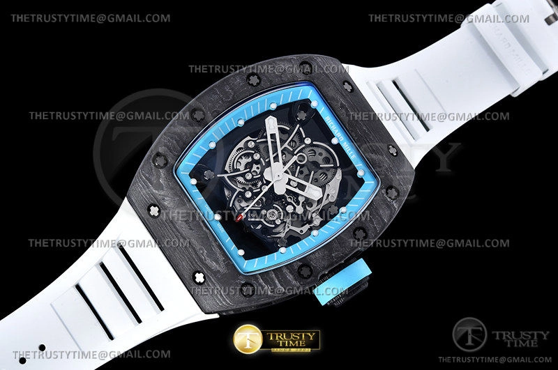 Часы Richard Mille из коллекции RM055. Спортивные мужские часы Richard Mille RM055 Yas Marina Circuit NTPT премиального качества (Артикул магазина: RM-0532) оснащены надежным автоматическим механизмом с автоподзаводом (работает от амплитуды движения руки) калибра Seiko NH05A, в котором реализованы следующие функции: часовая, минутная и секундная стрелки, а так же максимально простой функционал без усложнений. Бочкообразный корпус часов черного цвета, имеющий размер 42 мм X 50 мм и высоту 12.5 мм превосходно дополнит образ и украсит запястье своего обладателя. Для изготовления часов Richard Mille RM055 Yas Marina Circuit NTPT предлагаемых в нашем интернет-магазине, применяются карбон NTPT высокого качества (Швейцарский стандарт), а так же сапфировое стекло высокой прочности, благодаря чему обеспечивается максимальная защита от сколов и механических повреждений. Отличительной чертой данной модели является скелетонизированный циферблат, часовые индексы которого обеспечивают часовые метки. Завершает образ каучуковый ремешок белого цвета с фирменной раскладывающейся застежкой Richard Mille. Водонепроницаемость данной модели составляет 30М (WR30) – допускается минимальное воздействие с водой.