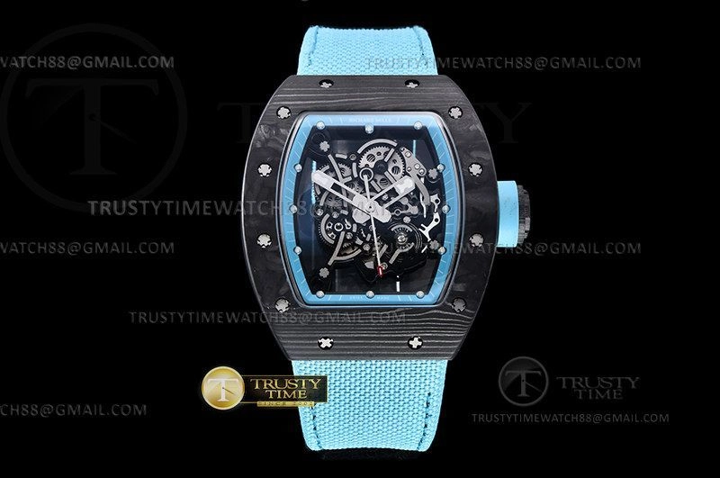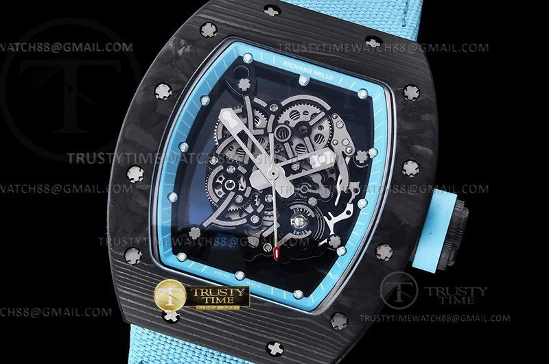 Часы Richard Mille из коллекции RM055. Спортивные мужские часы Richard Mille RM055 Yas Marina Circuit премиального качества (Артикул магазина: RM-0562) оснащены надежным автоматическим механизмом с ручным заводом калибра Seiko NH05A, в котором реализованы следующие функции: часовая, минутная и секундная стрелки, а так же максимально простой функционал без усложнений. Бочкообразный корпус часов черного цвета, имеющий размер 42 мм X 50 мм и высоту 12.5 мм превосходно дополнит образ и украсит запястье своего обладателя. Для изготовления часов Richard Mille RM055 Yas Marina Circuit предлагаемых в нашем интернет-магазине, применяются карбон NTPT высокого качества (Швейцарский стандарт), а так же сапфировое стекло высокой прочности, благодаря чему обеспечивается максимальная защита от сколов и механических повреждений. Отличительной чертой данной модели является скелетонизированный циферблат, часовые индексы которого обеспечивают часовые метки. Завершает образ нейлоновый ремешок голубого цвета на липучке Richard Mille. Водонепроницаемость данной модели составляет 30М (WR30) – допускается минимальное воздействие с водой.