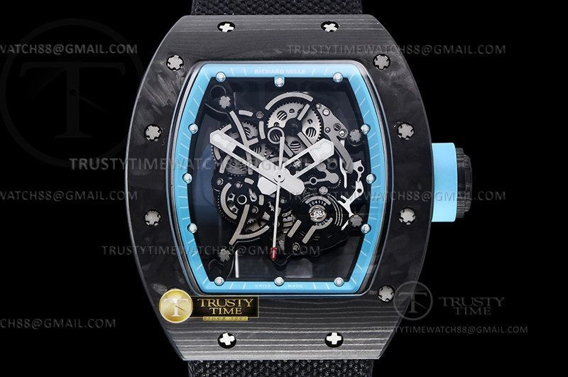 Часы Richard Mille из коллекции RM055. Спортивные мужские часы Richard Mille RM055 Yas Marina Circuit премиального качества (Артикул магазина: RM-0560) оснащены надежным автоматическим механизмом с ручным заводом калибра Seiko NH05A, в котором реализованы следующие функции: часовая, минутная и секундная стрелки, а так же максимально простой функционал без усложнений. Бочкообразный корпус часов черного цвета, имеющий размер 42 мм X 50 мм и высоту 12.5 мм превосходно дополнит образ и украсит запястье своего обладателя. Для изготовления часов Richard Mille RM055 Yas Marina Circuit предлагаемых в нашем интернет-магазине, применяются карбон NTPT высокого качества (Швейцарский стандарт), а так же сапфировое стекло высокой прочности, благодаря чему обеспечивается максимальная защита от сколов и механических повреждений. Отличительной чертой данной модели является скелетонизированный циферблат, часовые индексы которого обеспечивают часовые метки. Завершает образ нейлоновый ремешок черного цвета на липучке Richard Mille. Водонепроницаемость данной модели составляет 30М (WR30) – допускается минимальное воздействие с водой.