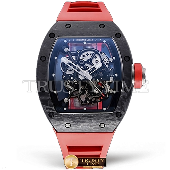 Часы Richard Mille из коллекции RM055. Спортивные мужские часы Richard Mille RM055 Bubba Watson премиального качества (Артикул магазина: RM-0567) оснащены надежным автоматическим механизмом с ручным заводом калибра RMUL2, в котором реализованы следующие функции: часовая, минутная и секундная стрелки, а так же максимально простой функционал без усложнений. Бочкообразный корпус часов черного цвета, имеющий размер 49.9 мм x 42.7 мм и высоту 13.5 мм превосходно дополнит образ и украсит запястье своего обладателя. Для изготовления часов Richard Mille RM055 Bubba Watson предлагаемых в нашем интернет-магазине, применяются карбон NTPT высокого качества (Швейцарский стандарт), а так же сапфировое стекло высокой прочности, благодаря чему обеспечивается максимальная защита от сколов и механических повреждений. Отличительной чертой данной модели является скелетонизированный циферблат, часовые индексы которого обеспечивают часовые метки. Завершает образ каучуковый ремешок красного цвета с фирменной раскладывающейся застежкой Richard Mille. Водонепроницаемость данной модели составляет 30М (WR30) – допускается минимальное воздействие с водой.